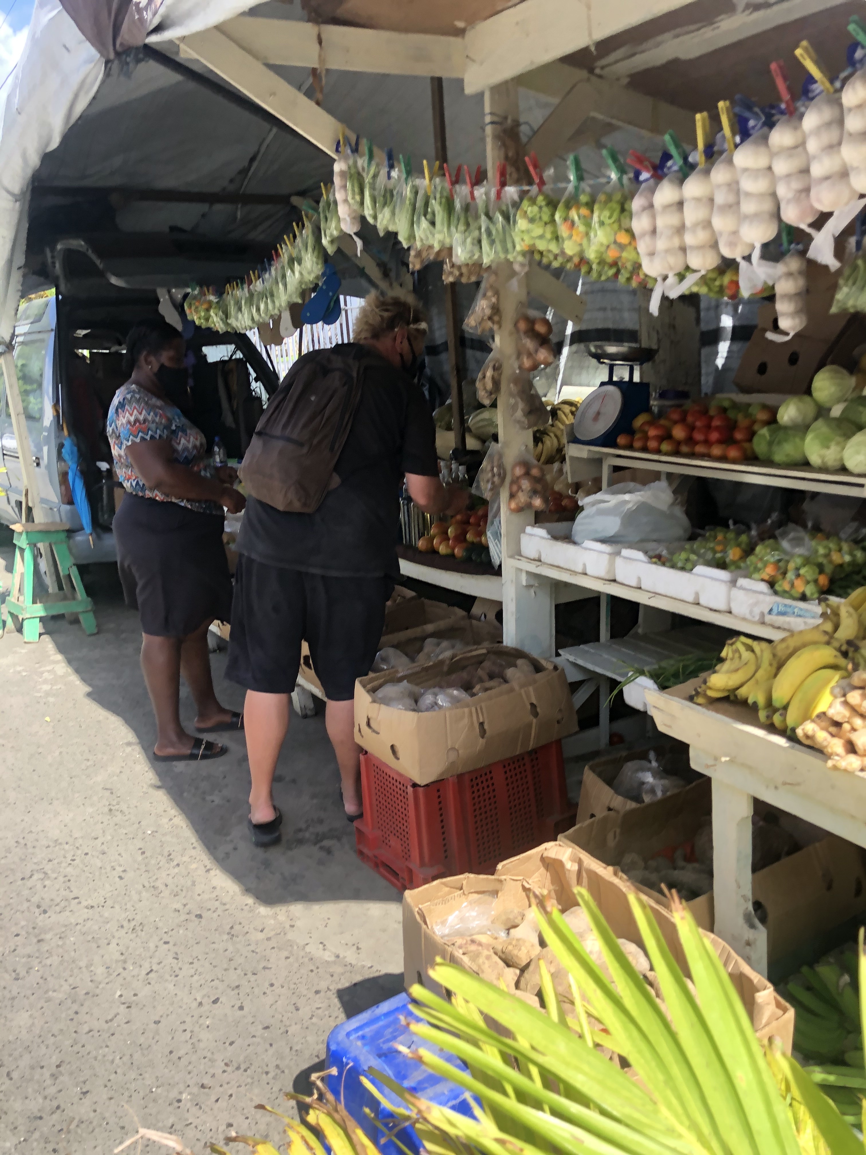 Vi var ved at løbe tør for friske vare. Så vi tog en hike ind til byen Ashton, men indkøbsmulighederne var begrænset. En dåse af de grumme pølser koster 70 kr, og i samme kiosk kunne man købe hår-extensions til omkring 40 kr. Vi fandt lidt agurker, bacon, kål, kiks. Vi må nok tilbage til Bequia og handle, og så kan vi også hente vores storsejl.
