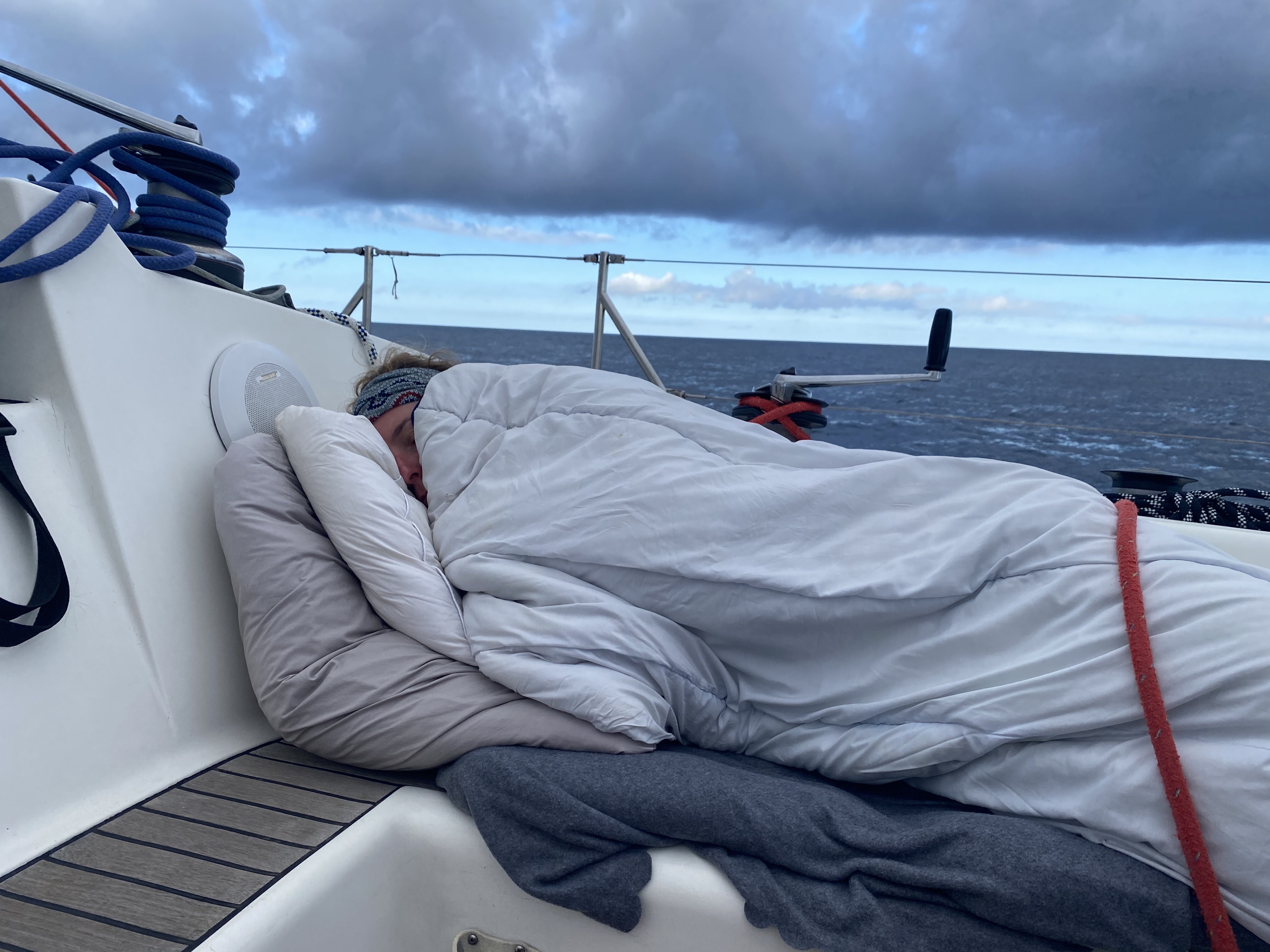 Vi suser stadig afsted. Dagen er gået med at sove og styre. Stadig søsyge og trætte. Vi har allerede lidt udfordringer med strømmen, da det har været let overskyet og båden krænger modsat solen halvdelen af dagen. Vi sætter motor i et par timer. Det blæser op hen på natten og en pludselig ubestemmelig vind på 20 sm flænser storsejlet, ingen kommer noget til, men det er kritisk med storsejlet. Resten af natten går for forsejl. Stemningen er trykket, da vi går i seng.