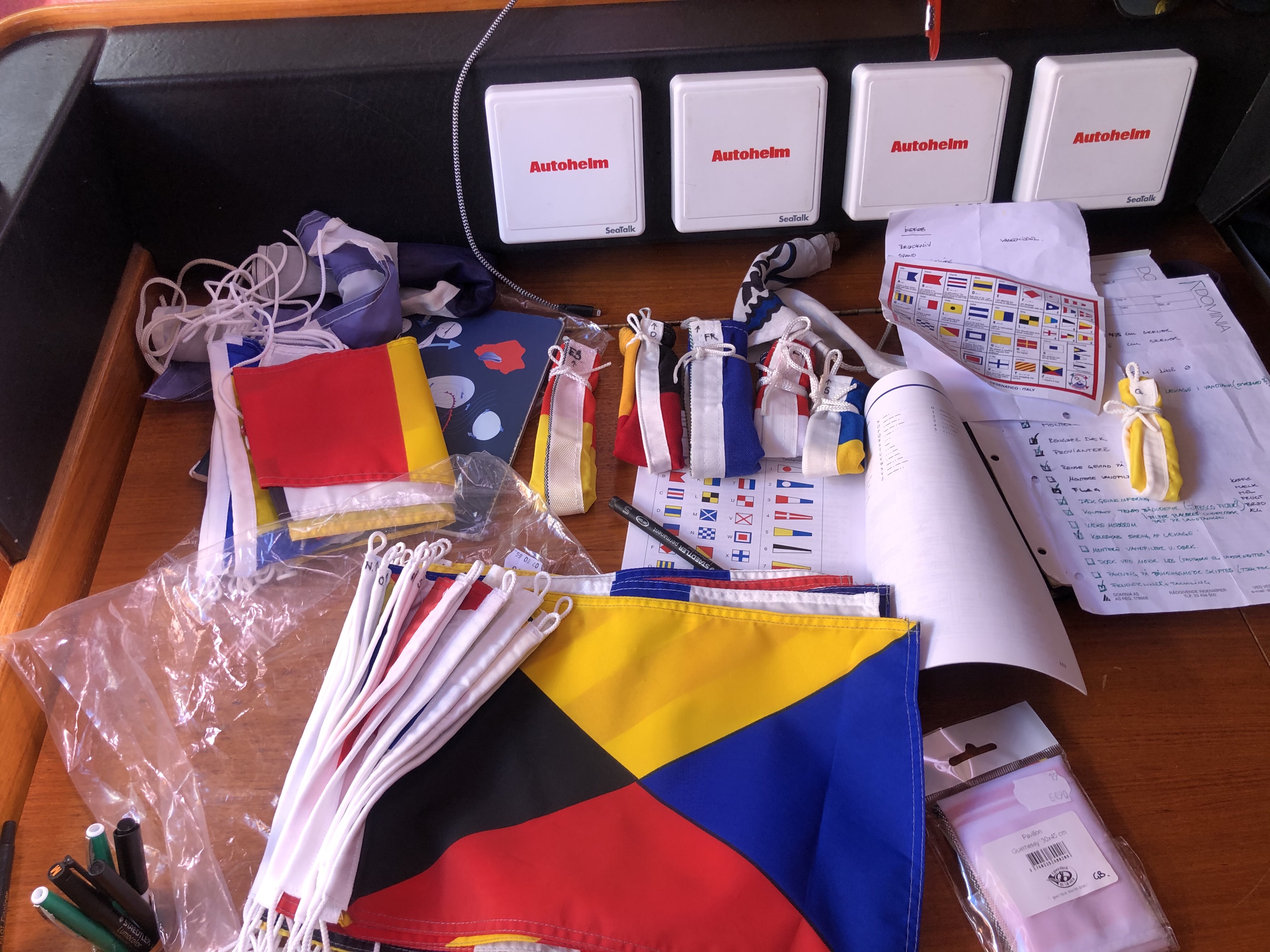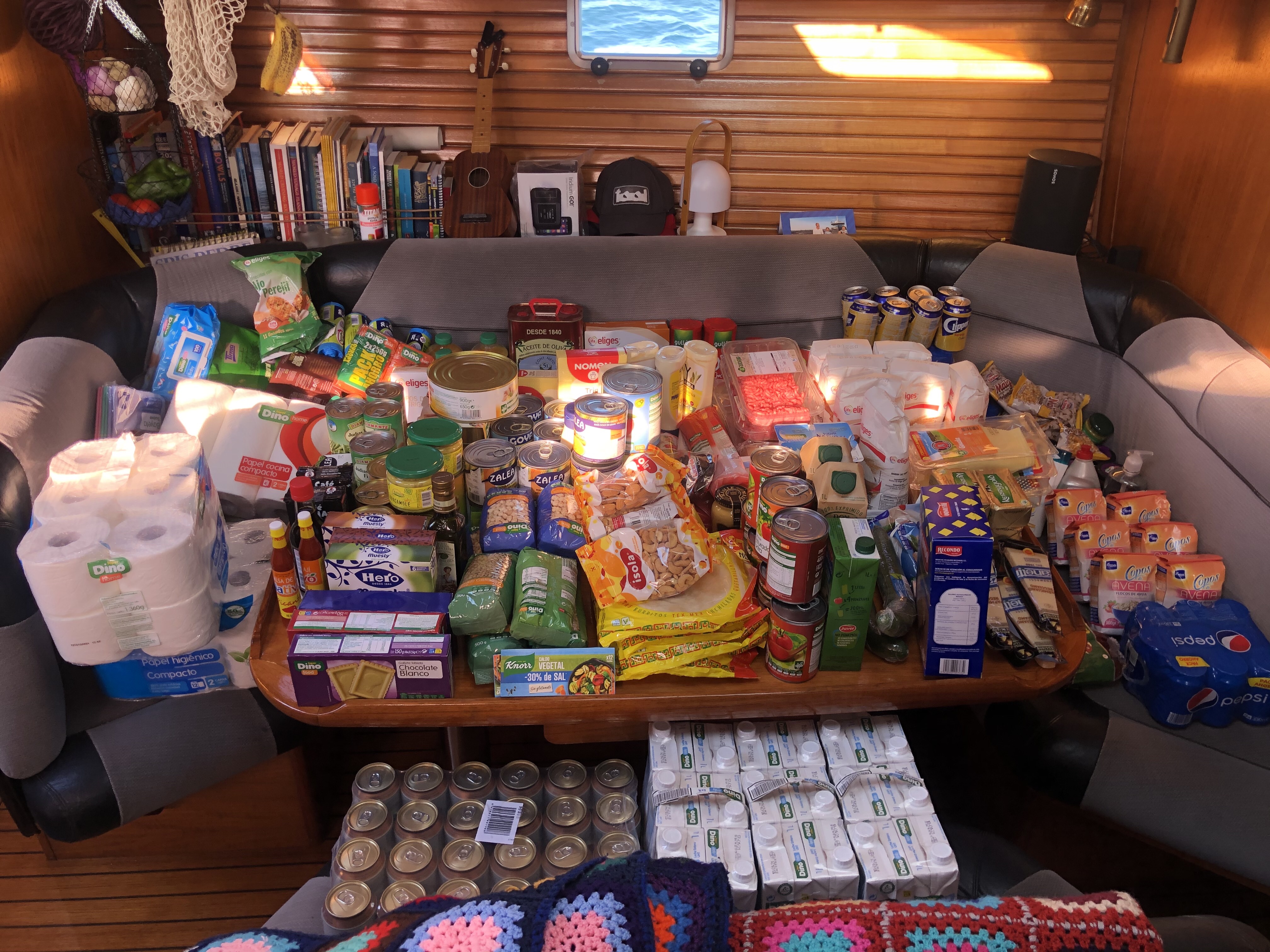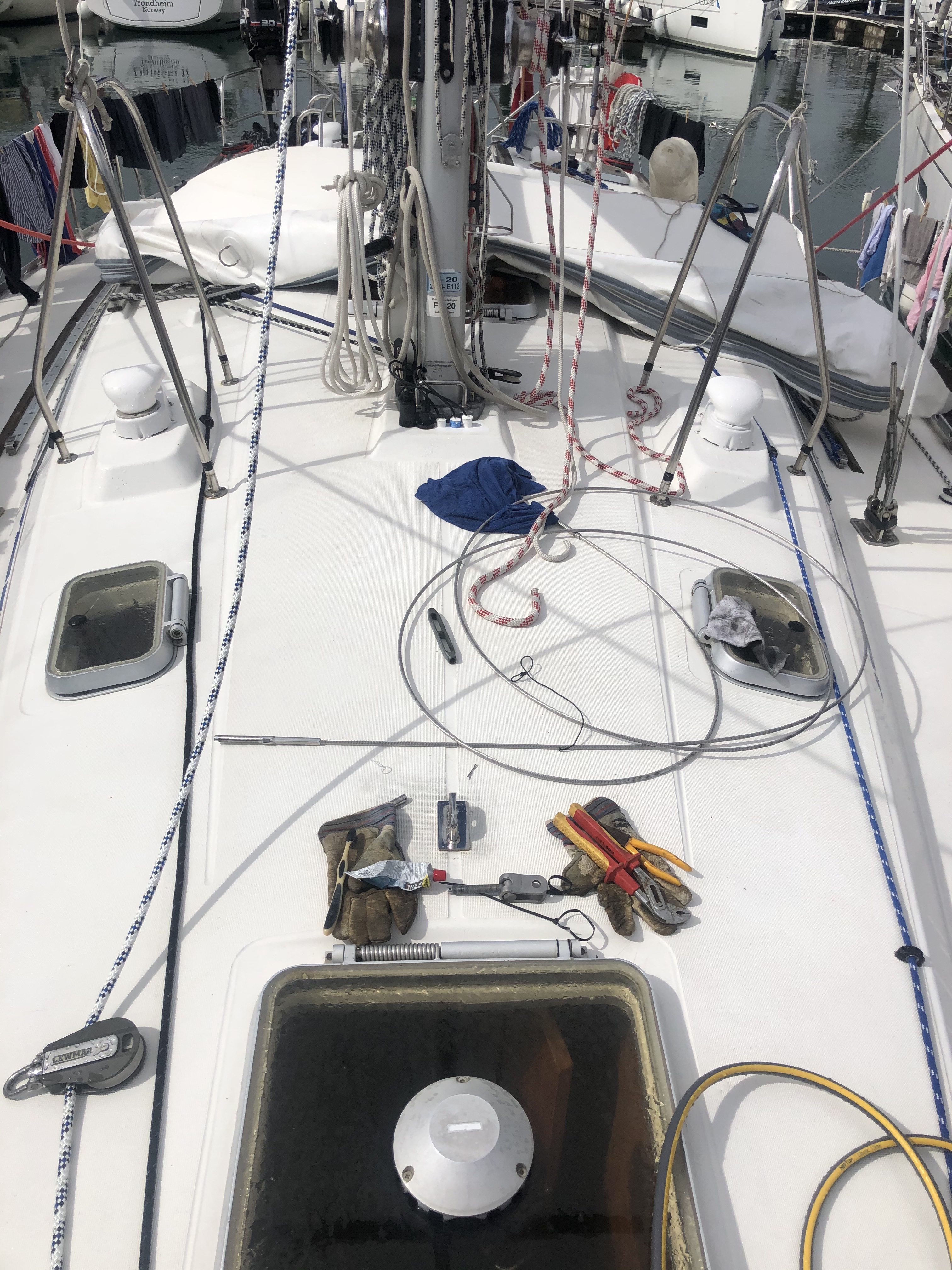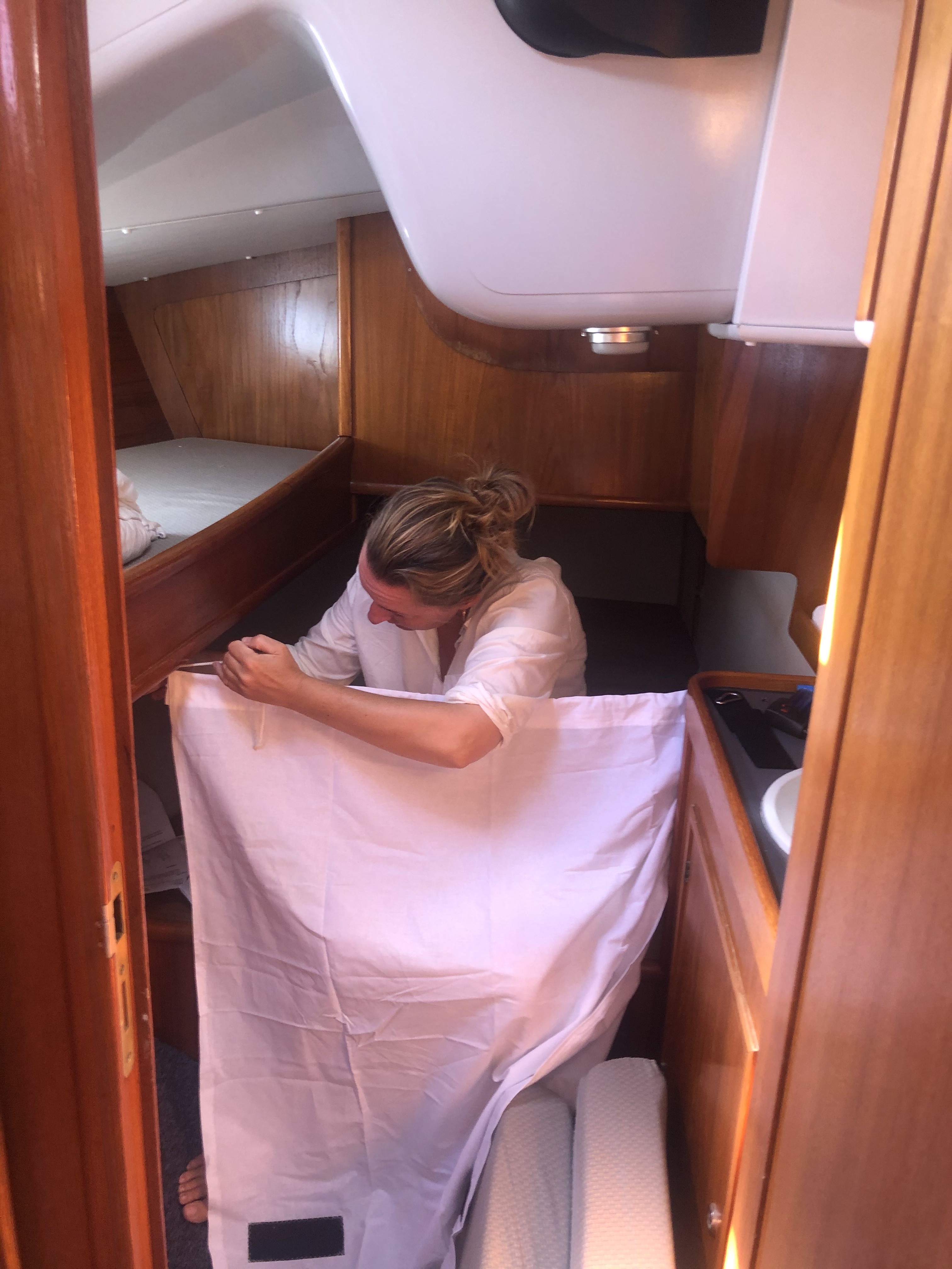 Rengøring under dørk til tørkostIndkøb vol. 1I foråret syede vi ‘slingregrej’, det skal nu monteres.Tilstoppet septiktank. Vi kan ikke få suget septiktank her i havnen, så vi har selv forsøgt at komme problemet til livs. Det lykkedes vist nok efter flere timers fejlfinding…..fy for den lede….seriøse brækfornemmelser! Al klor og Rodalon er opbrugt. Nu skal vi finde en måde at montere kværnen.Bimini samlet og monteretMarkeringerne på ankerkæden er ved at være slidte, så nye skal sprayes. Vi har ikke omgangstæller på damen, så 5 og 10 meter markeringer på kæden er nødvendige. Vi har har 60 meter kæde (10mm) + 50 meter tovværk.Pause. Bananpandekager på båden ArtemisIndkøb af udstyr: Vandbeholder til ekstra 150 liter vand. Satellittelefon, kværn til toilet, holder til redningsbøje, karabinhager til slingregrej, dunke til ekstra diesel….