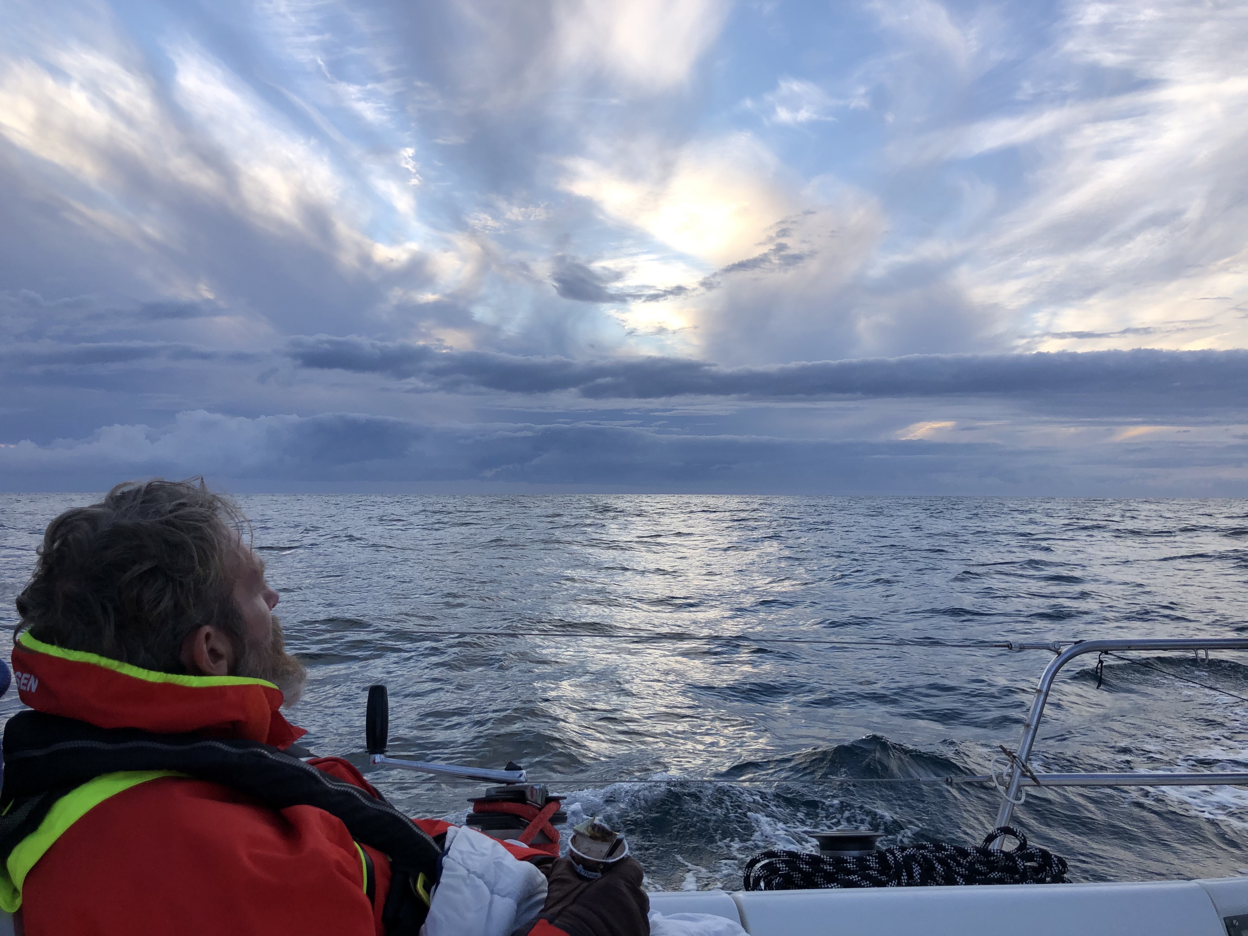 Turen gik fint, men natten var lidt spændende, til at starte med var vejret klart. Delfinerne kom på besøg, der var morild i vandet, så deres fartstriber lyste op. Selv i toilettet var der morild. Hen på natten blev vi ramt af tæt tåge. Man kunne ikke se mere end en bådslængde, og det er på de her tidspunkter, man bliver glad for sin radar. Det er nemlig ikke alle fiskerbåde, som har AIS, så de er ikke lige til at se i tåge. Deres retning kan også være ret ubestemmelig. Vi var faktisk lidt i tvivl, om vi skulle have en radar, da vi netop har AIS og altid er på udkig. Man må jo prioritere ressourcerne.
