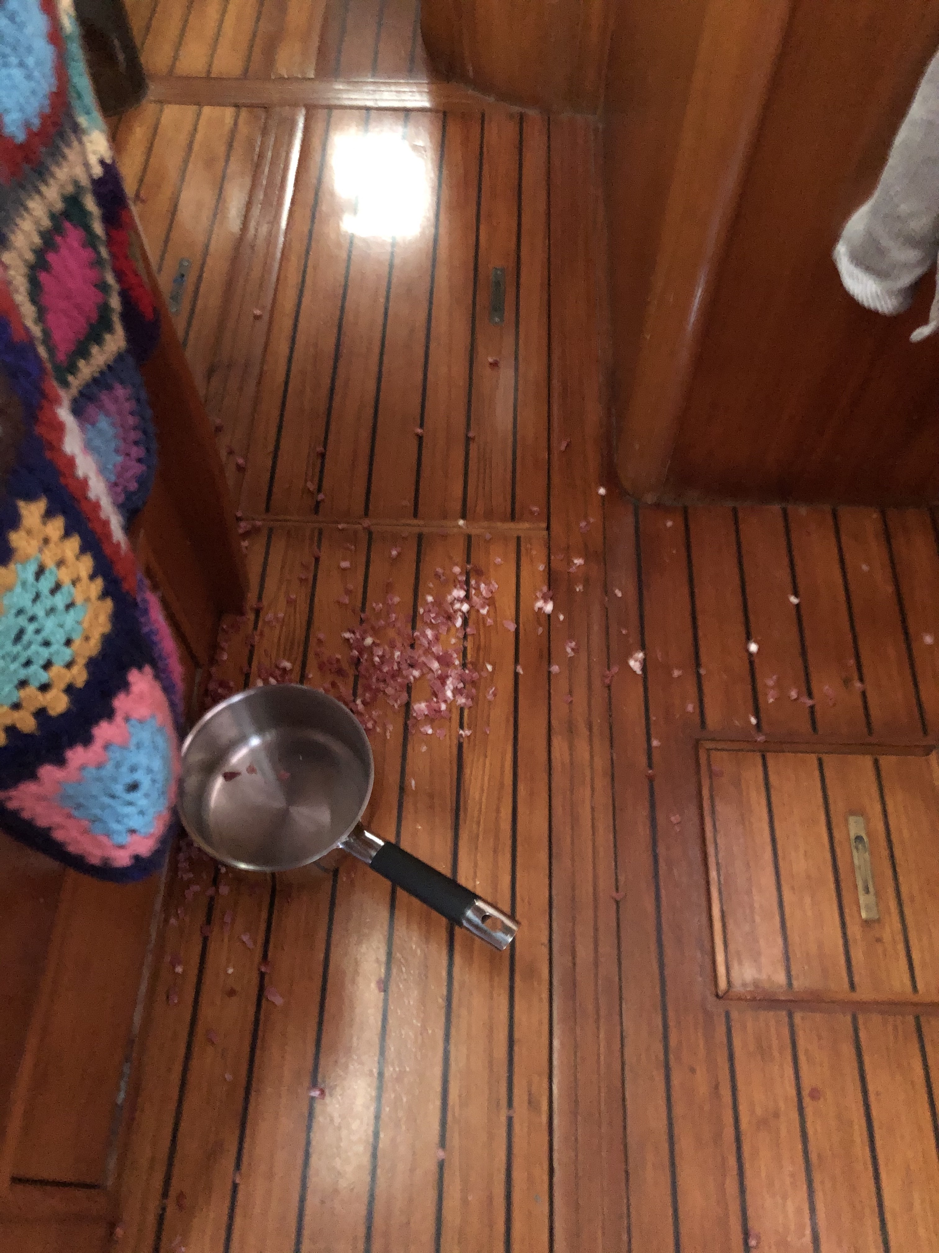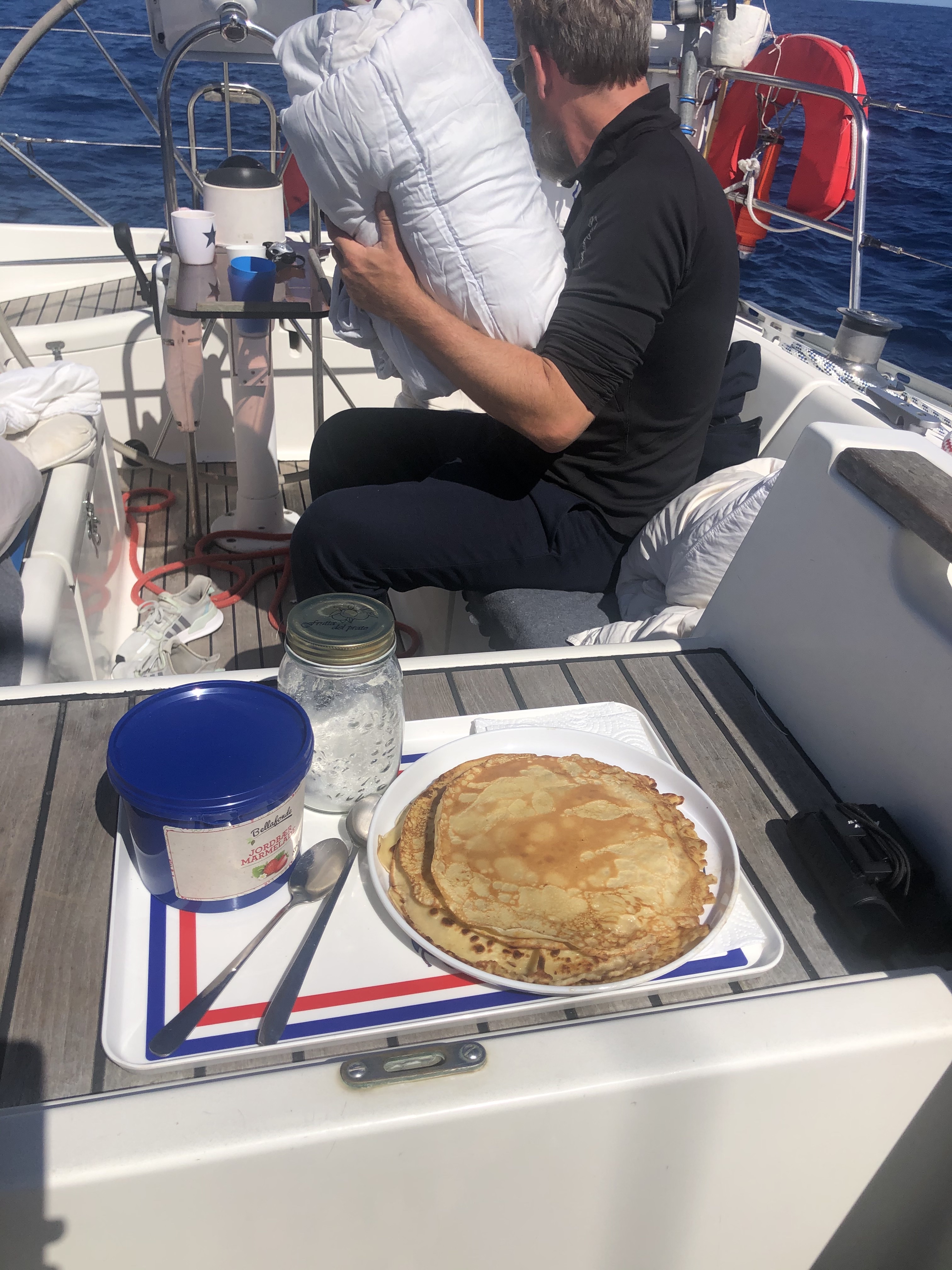 Bacon på gulv. Husk at holde fast, også på dig selv. Spiste en dåse tun i stedet, orkede ikke madlavning. Ikke engang kaffe drak vi!Der er indført klokken-15-cola-og-popcorn når vi sejler. Det kunne vi lige få ned i skrutten, og det tidspunkt, hvor vi begge var ok friske.