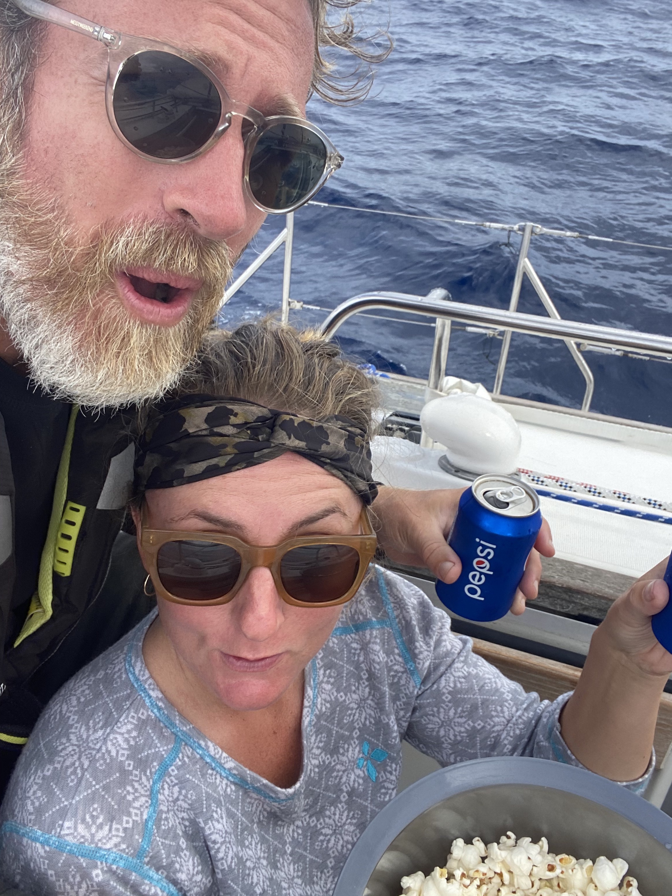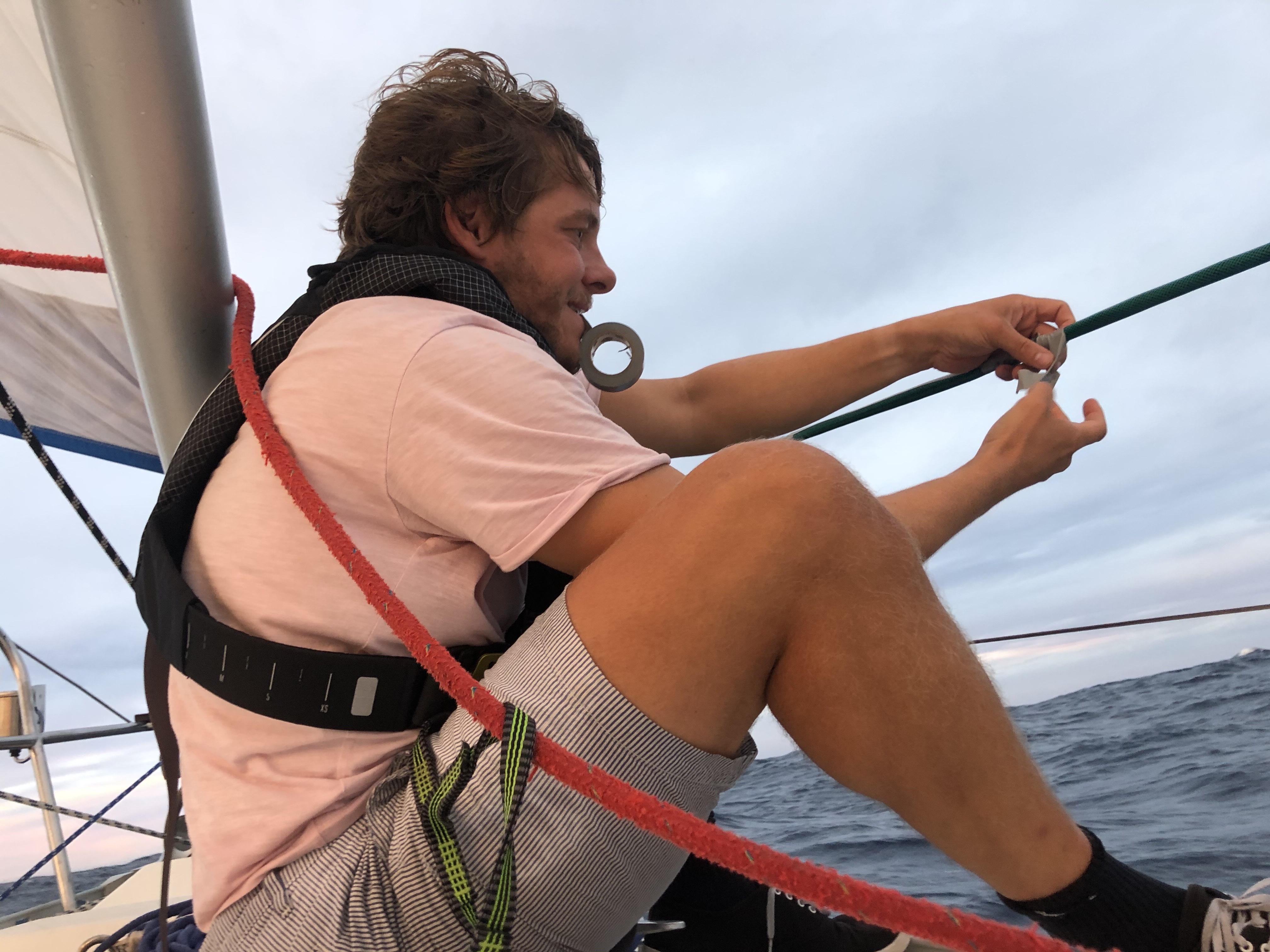 Natten har været mega gyngende, men vi har trods alt skudt en fin fart på 6-7 knob. Gitte og Christoffer fortsætter med at reparere sejl. Resten sørger for, at vi kommer fremad. Der kommer fisk på krogen to gange, men de hopper begge af. Pis. Sejlet er færdigt da vi skal ha’ kl-15-Pepsi-og-popcorn, her drøfter vi også livet om bord generelt; skrald, vagtplan, sikkerhed, sejlsituationen. Efter popcorn sætter vi storsejlet i første reb. Sejlet holder, men det er for svagt i agterliget, og vi beslutter at forsøge at reparere det yderligere den kommende dag. Bølgerne er omkring 3 meter. Vi gynger stadig meget.