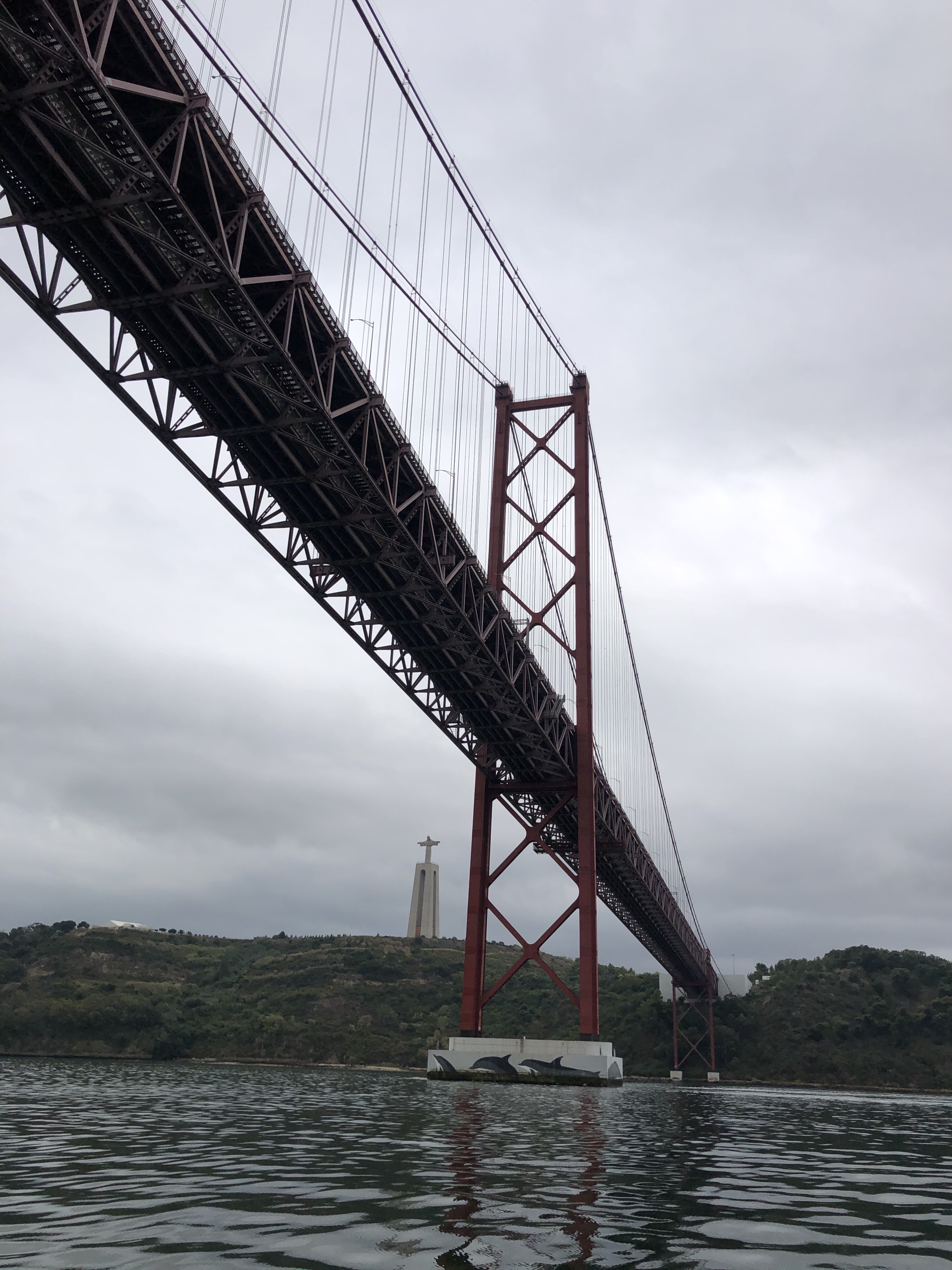 Hej Lissabon! Broen larmer som en mega bistade, og vi kunne ikke høre vores egen motor. Det viste sig, at bilerne kører på riste. Man kan kigge op på undersiden af bilerne på broen.