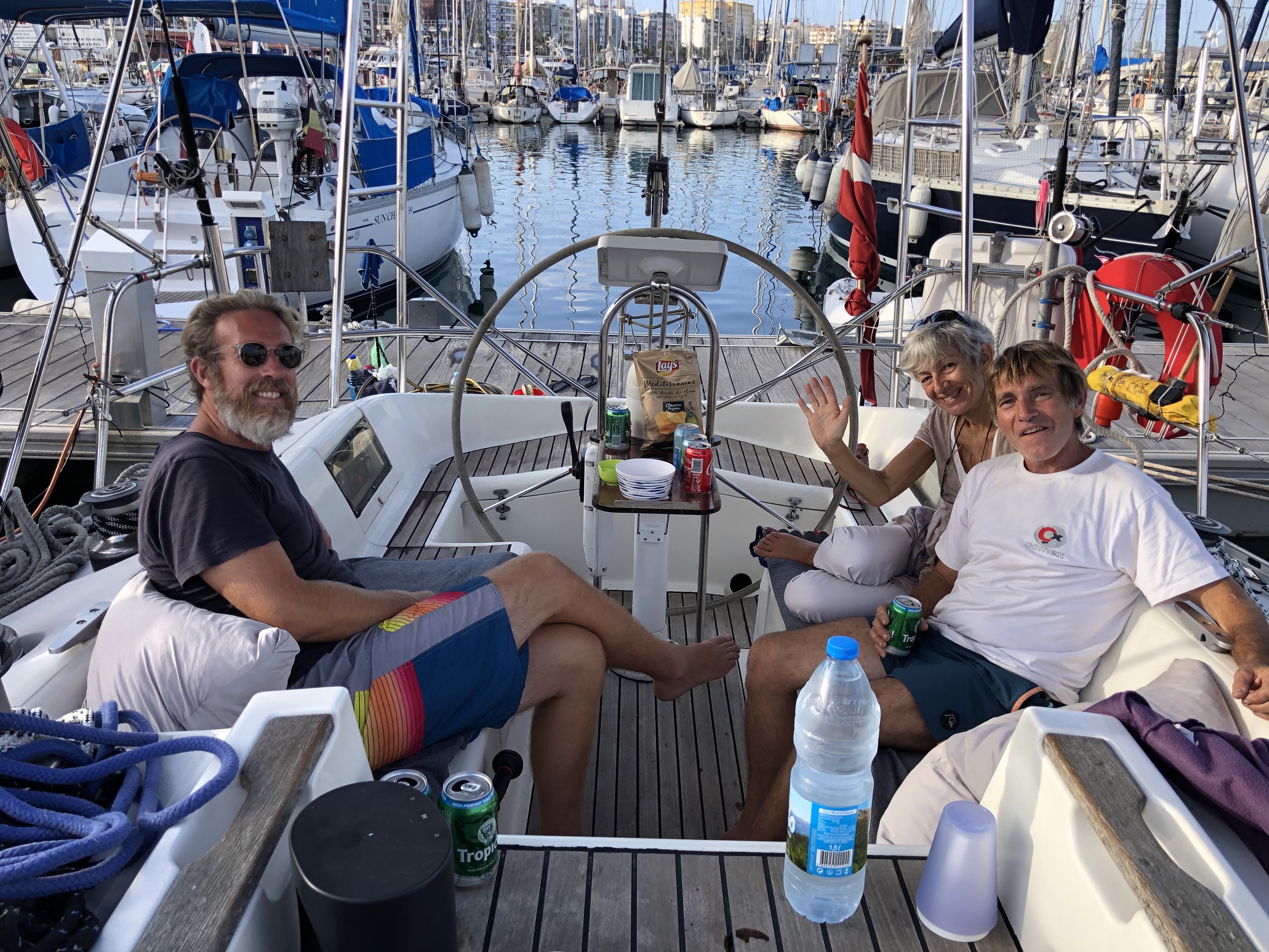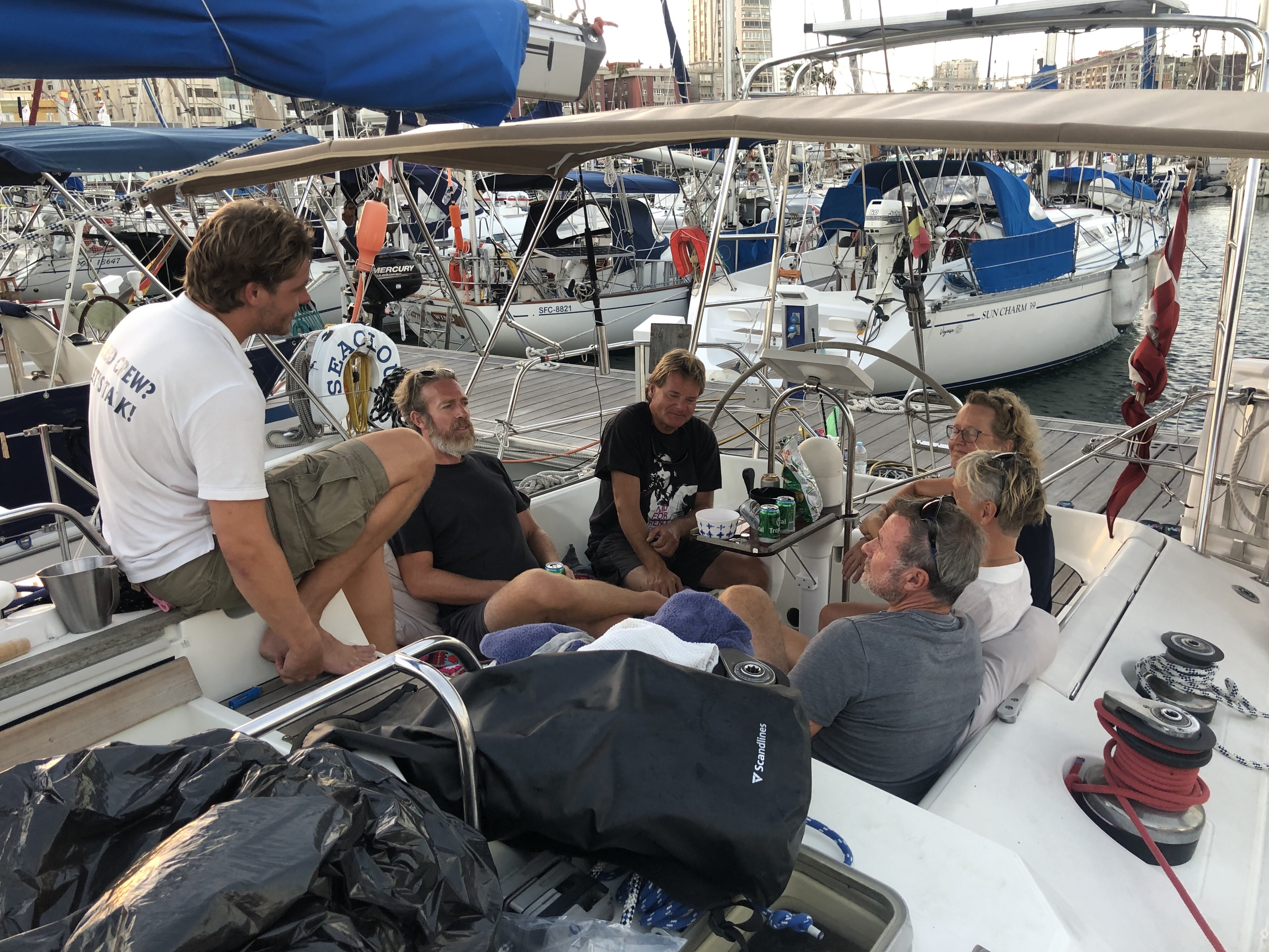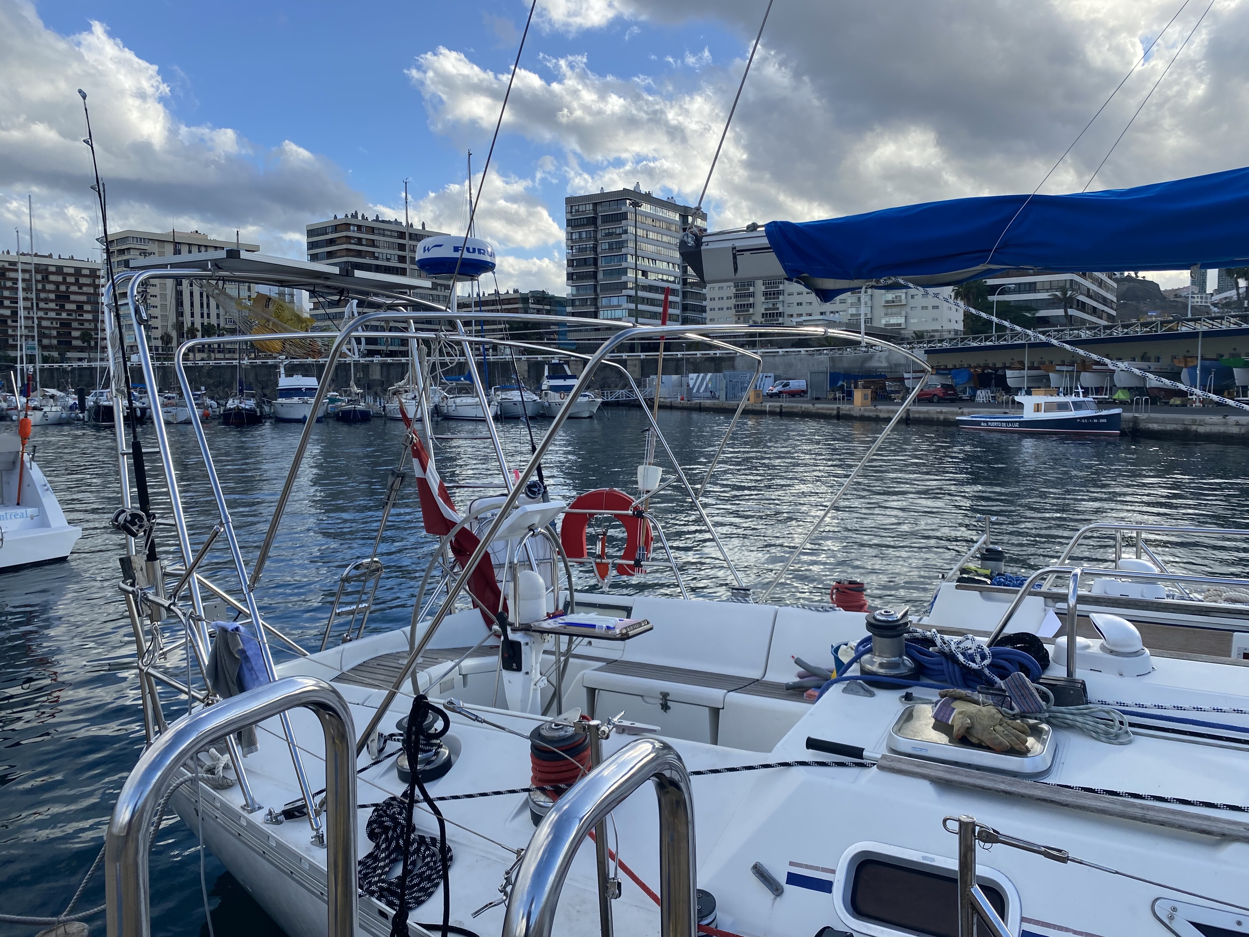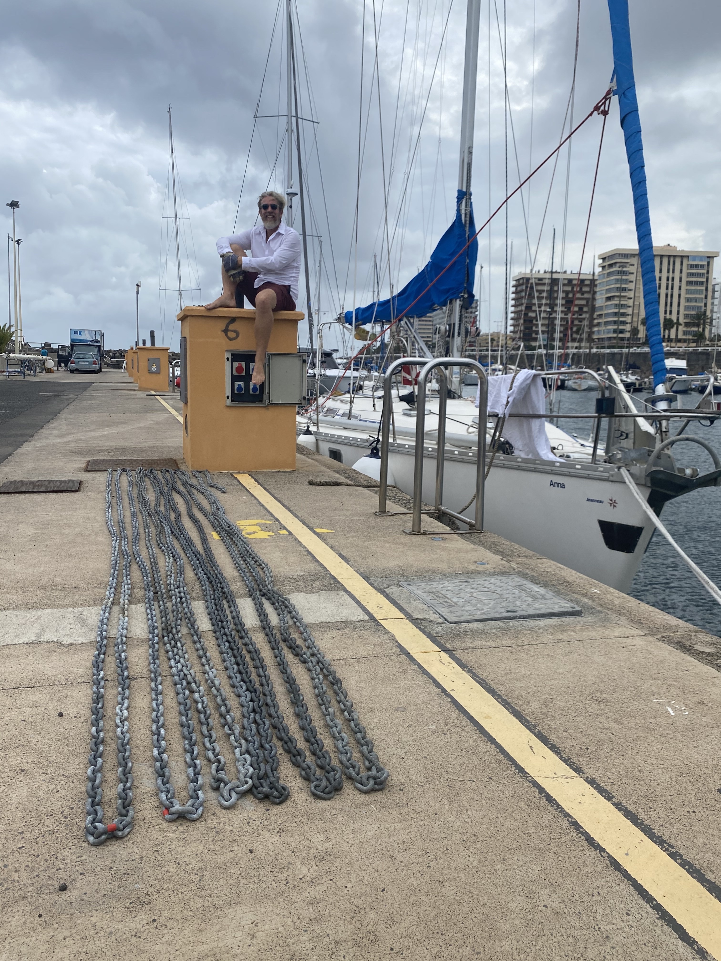 Mens der var fly-kaos, begyndte vi at skabe kontakt til en ekstra gast eller to, i håbet om at kunne krydse, hvis vores gaster fra DK ikke ville nå herned. Der er en del båd-blaffere her, som søger en tur over Atlanten. Nogen har aldrig været på en båd før, andre har mere eller mindre erfaring. Vi fik en rigtig go’ kontakt til en hollænder Arjen, som vi tilbød at være på båden, for at se os an – og omvendt. Det lader til han bliver hængende, det synes vi er ganske glimrende, så nu blivet vi 5 ombord – perfekt!