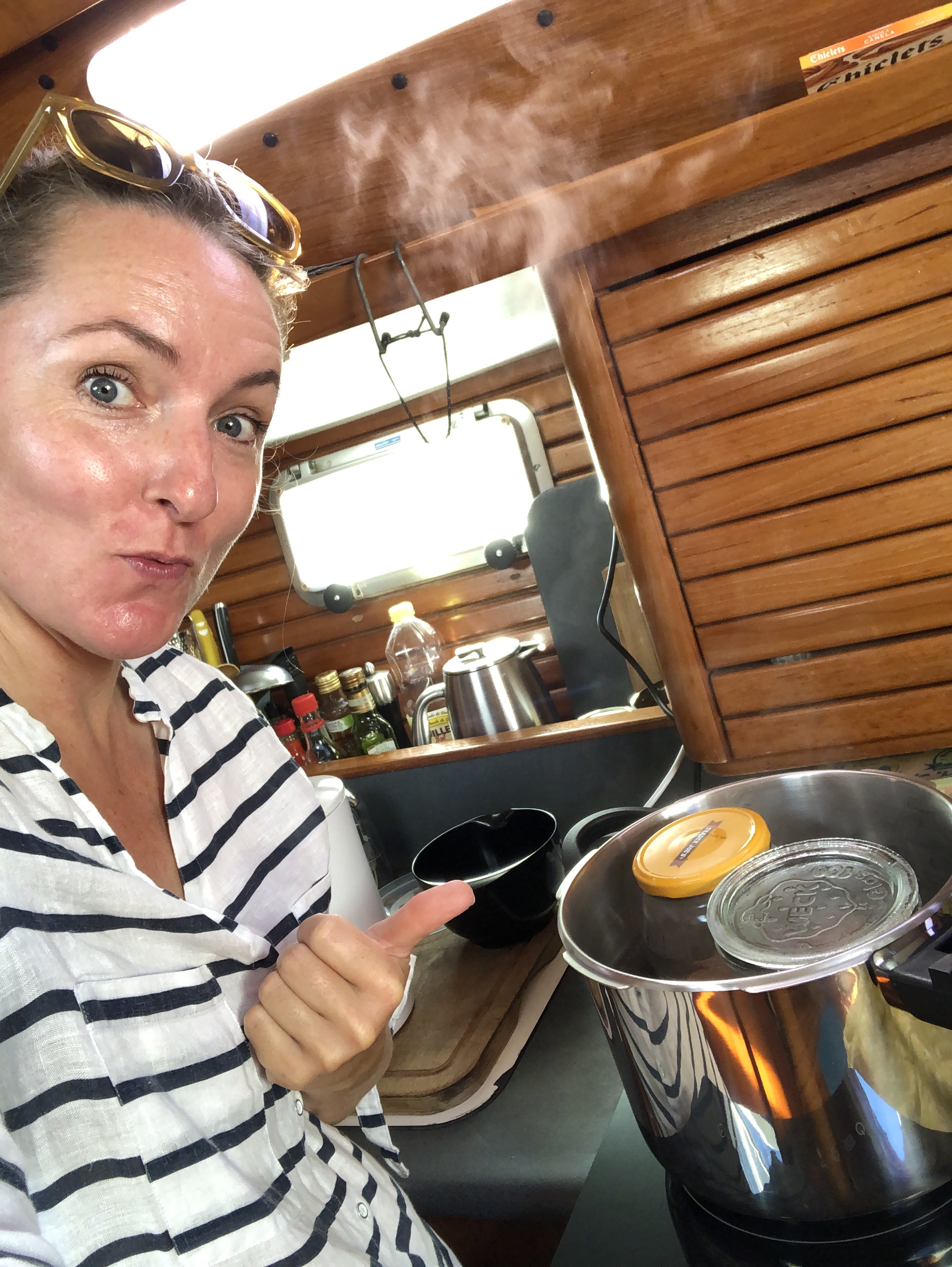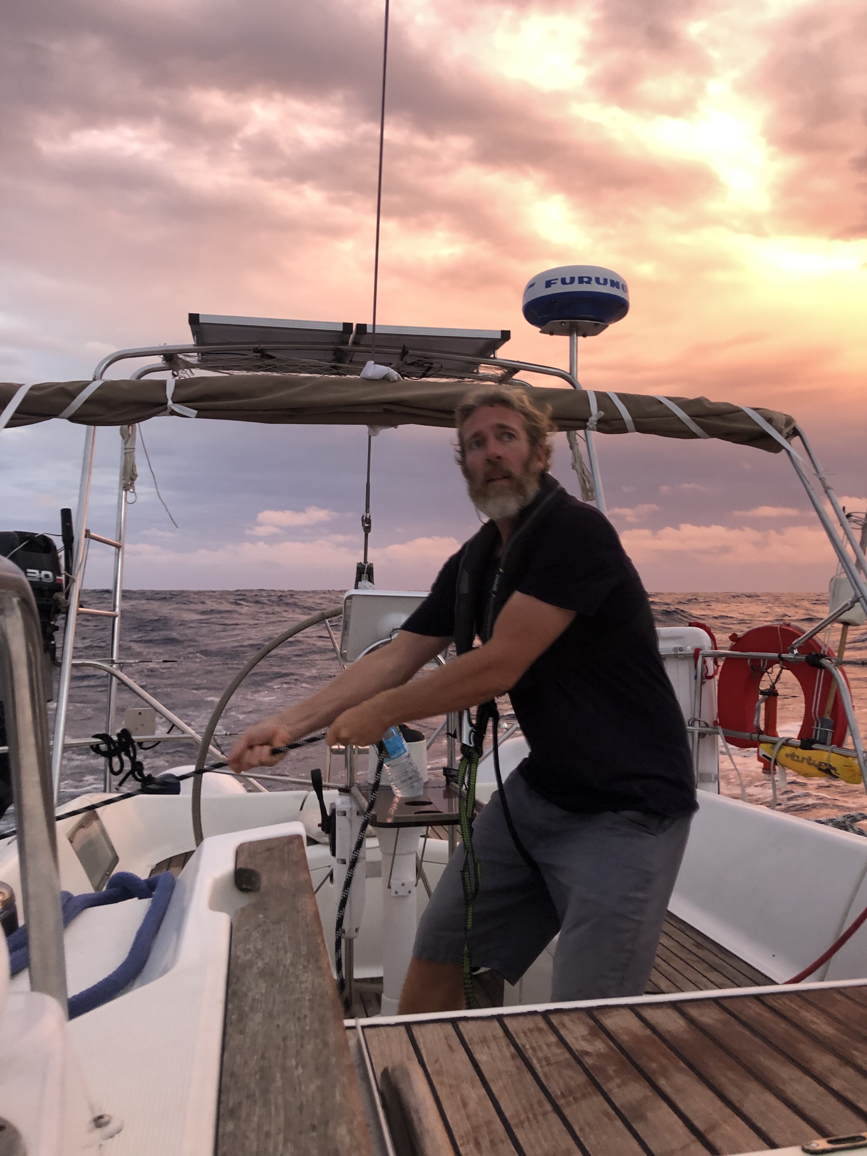 I nat susede vi afsted med 8 sekundmeter og et par små regnbyger. Himlen var fuld af stjerneskud. 4 af os tippede, at vi ville komme i land i dag. Vi er først i land i morgen, og Muddi vinder igen. Vi sveder, glæder os til at komme i land, til et bad eller tre, friske grøntsager og rent sengetøj. Vi sætter motor ved middagstid, vinden er helt væk. Vi bruger sidste glas med henkogt kylling med tilbehør af sødekartofler, løg og ris.