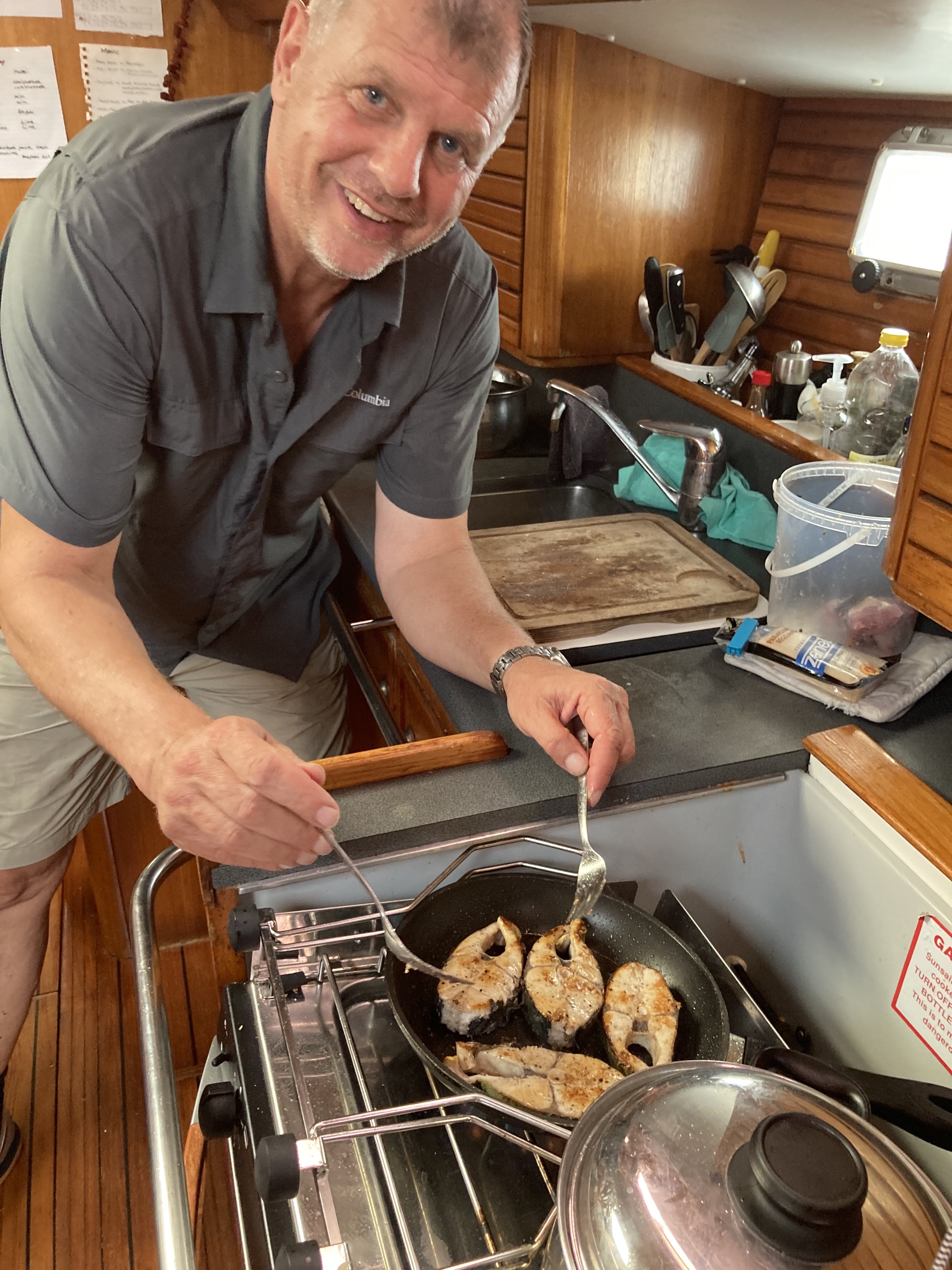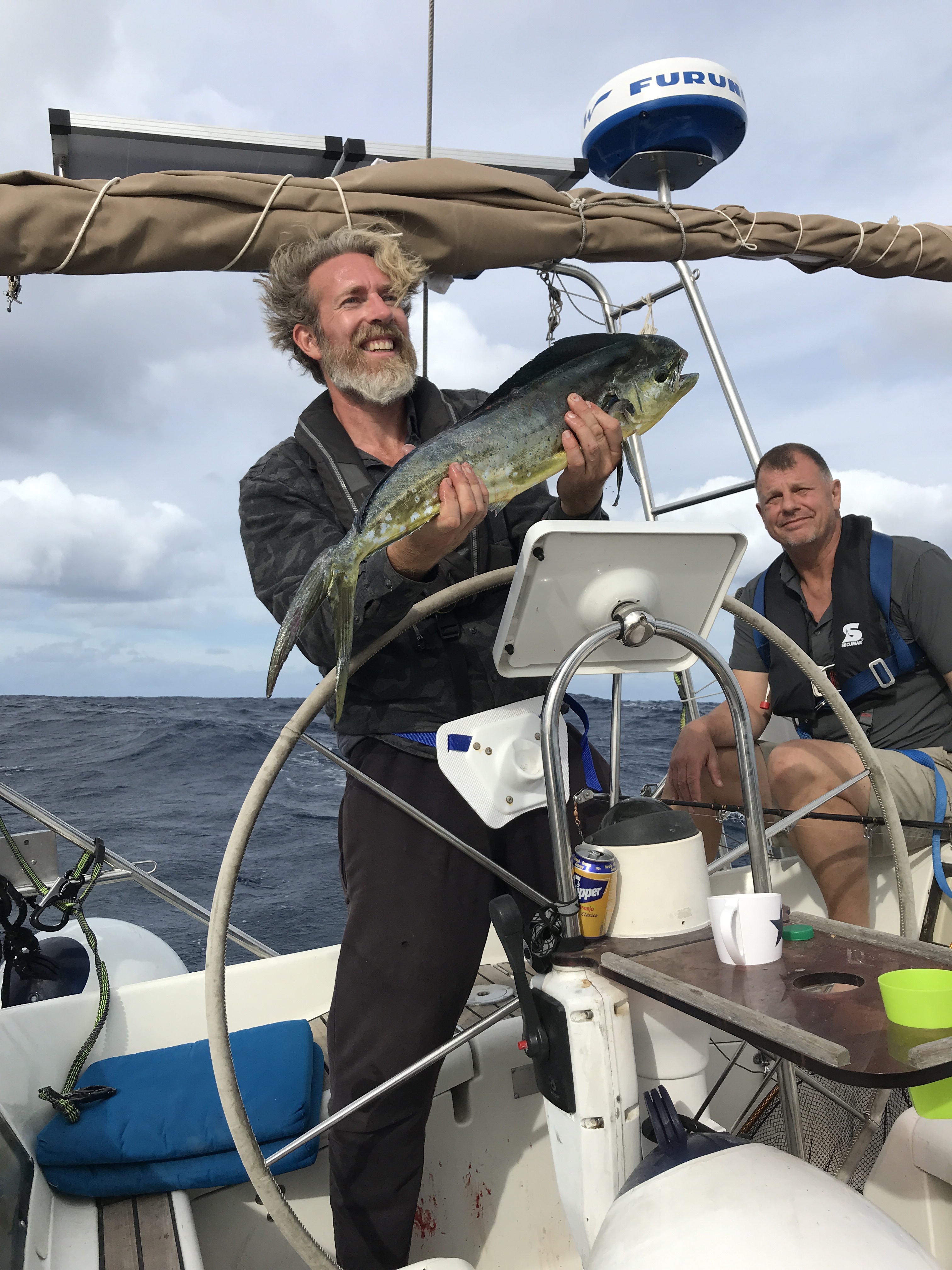 Dagene gik med at holde udkig, læse, sove, spise, piske en stemning op over at se delfiner, tun og hvaler. Jean-Pierre havde nævnt, at vi ville se tun – det gjorde vi! Der var mange, så det var ud med krogen!
