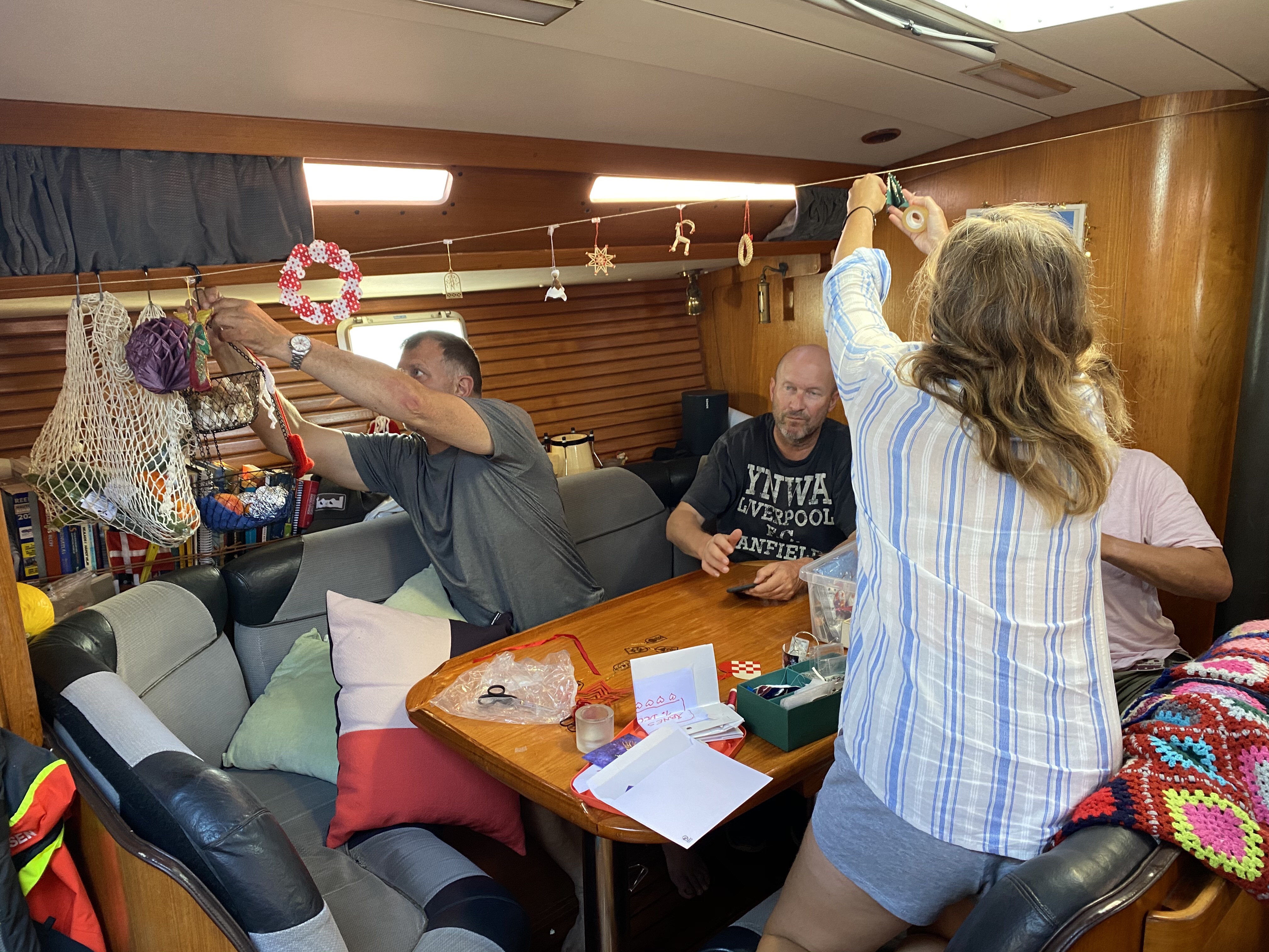 Det er en flot og varm dag. Vinden er aftaget en smule, men bølgerne er der stadig fra forskellige retninger. Vi slapper af, efter et par urolige dage. Vi arbejder stadig på at få tørret stævnen efter vandsækkens læk. Det var ikke meget vand, men vi har mange ting opbevaret derude. Vi fejrer den hollandske jul, Santa Klaas d. 5. December med O’Boy chokodrik, rom-sjus, slik og pebernødder. I Holland giver man hinanden gaver i dag og et digt. Så vi giver også digte i dag. Det er tydeligt, at Arjen er rutineret. Vi synger Glade Jul, Norwegian Wood og Personel Jesus. Vi får sms fra båden Harmatten, som ligger 30 sømil nord for os, de har også haft udfordringer med flænge i storsejl, udskiftning af slidte skøder og manglende strøm….jeps, never a dull moment.