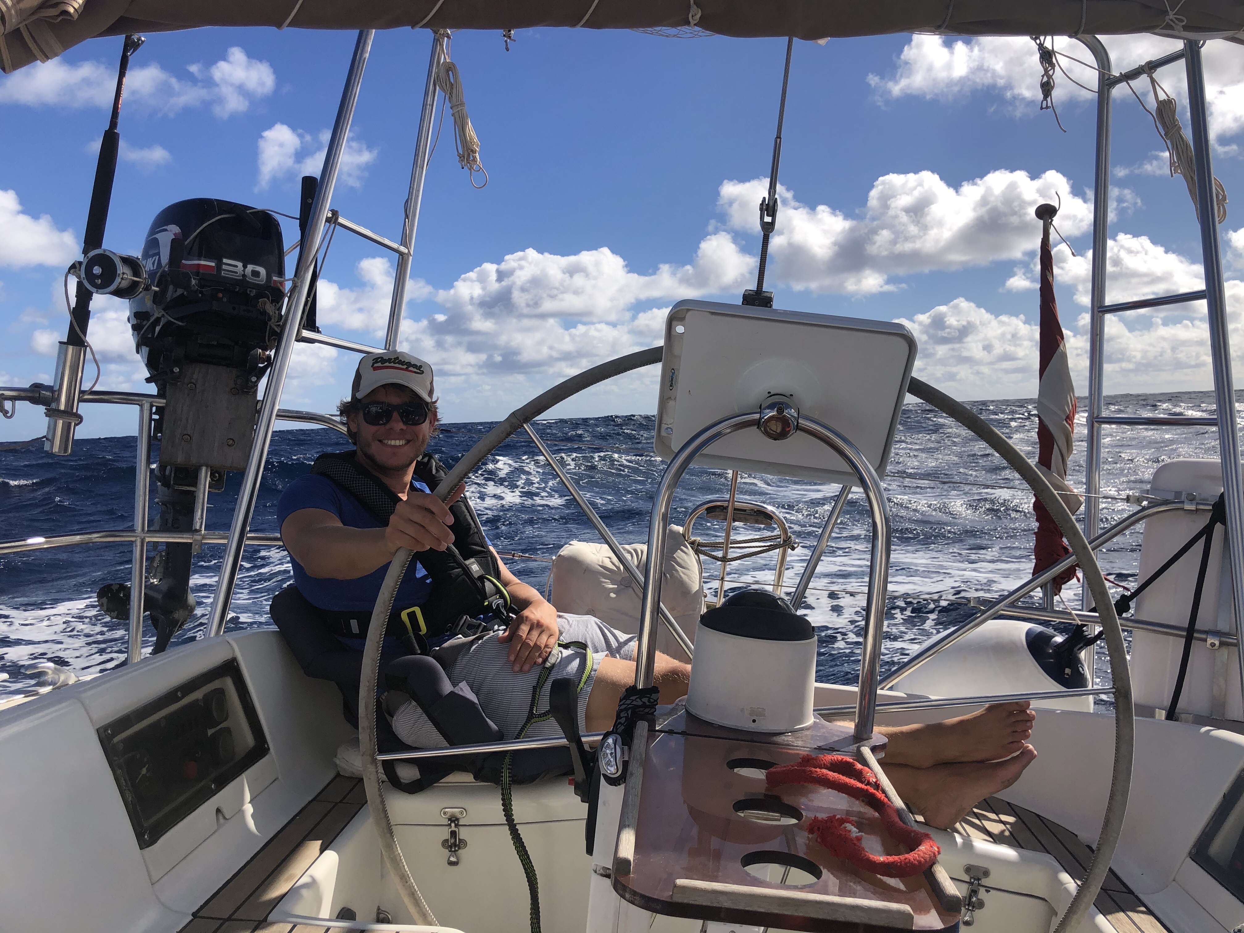 Til at starte med kunne vi liiige holde kursen med en vind på 8 sekundmeter. Men til sidst måtte vi sætte motor, hvis ikke vi skulle ende på Algarve. Hen på den efterfølgende formiddag blæste det pludselig op til 20 sekundmeter, og vi fik en skylle. Efter en times tid løjede vinden af, og vi satte sejl igen og susede afsted. Sådan gik turen. Sejl. Motor. Sejl. Der var mange perioder, hvor vi ikke fik fart nok i båden til at ride på dønningerne, som kom fra nord, så vi gyngede afsted. Overskuddet var ikke rigtig tilstede, og lidt mild søsyge meldte sig.