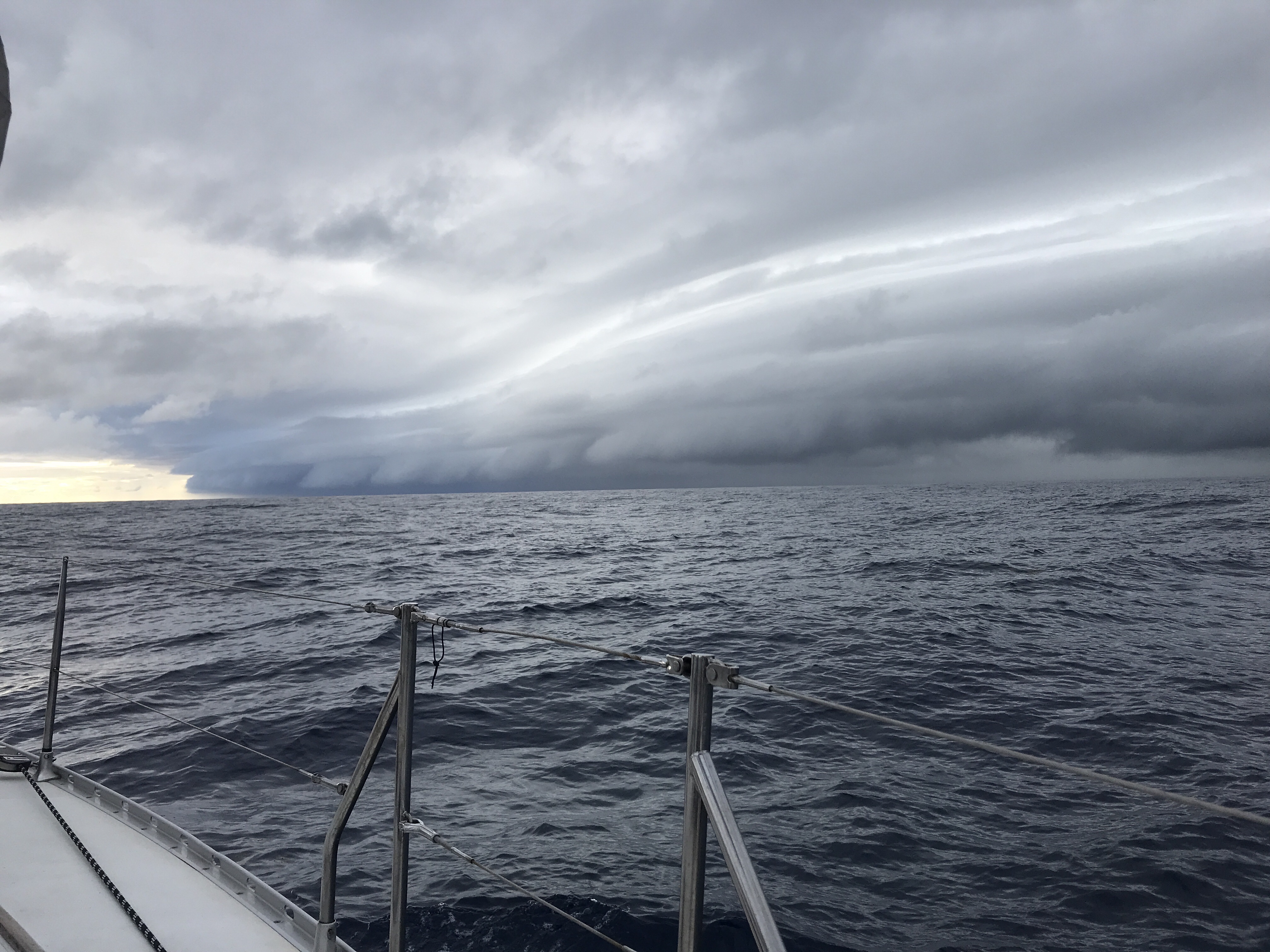 Vi har sejlet for motor side midnat. Der er ingen vind og dagen er varm. Bølger er der ikke noget af. Vi dovner den. Sidst på eftermiddagen samler skyerne omkring os. Vinden kommer nu som en halvvind fra nord. Efter et par timer, kan vi se en front fra nord nærme sig. Vi gør os klar til uvejr. Vinden tiltager til 25 sekundmeter, og lidt efter kommer regn, derefter bølger. Efter en times tid, er vi nede på 15 sekundmeter, og vi hiver en snas ud af forsejlet og slukker motoren. De næste par timer går vi 6 knob med en vind på 10-12 sekundmeter. Søen er håbløst urolig. Vi får ikke sovet meget den nat. Vi har iøvrigt 1000 sømil tilbage, det skal fejres! Christoffer for en flyvefisk i øjet, av!