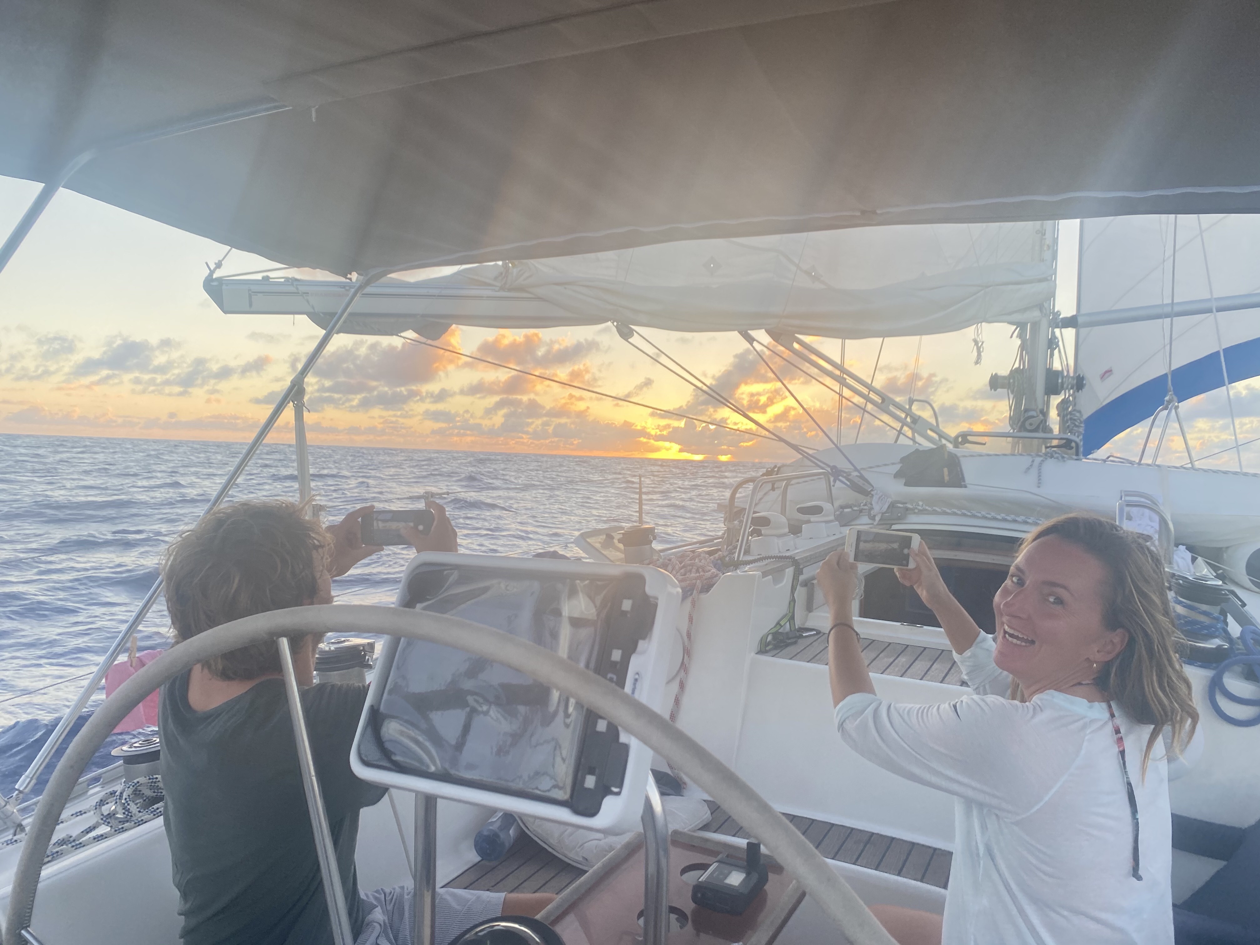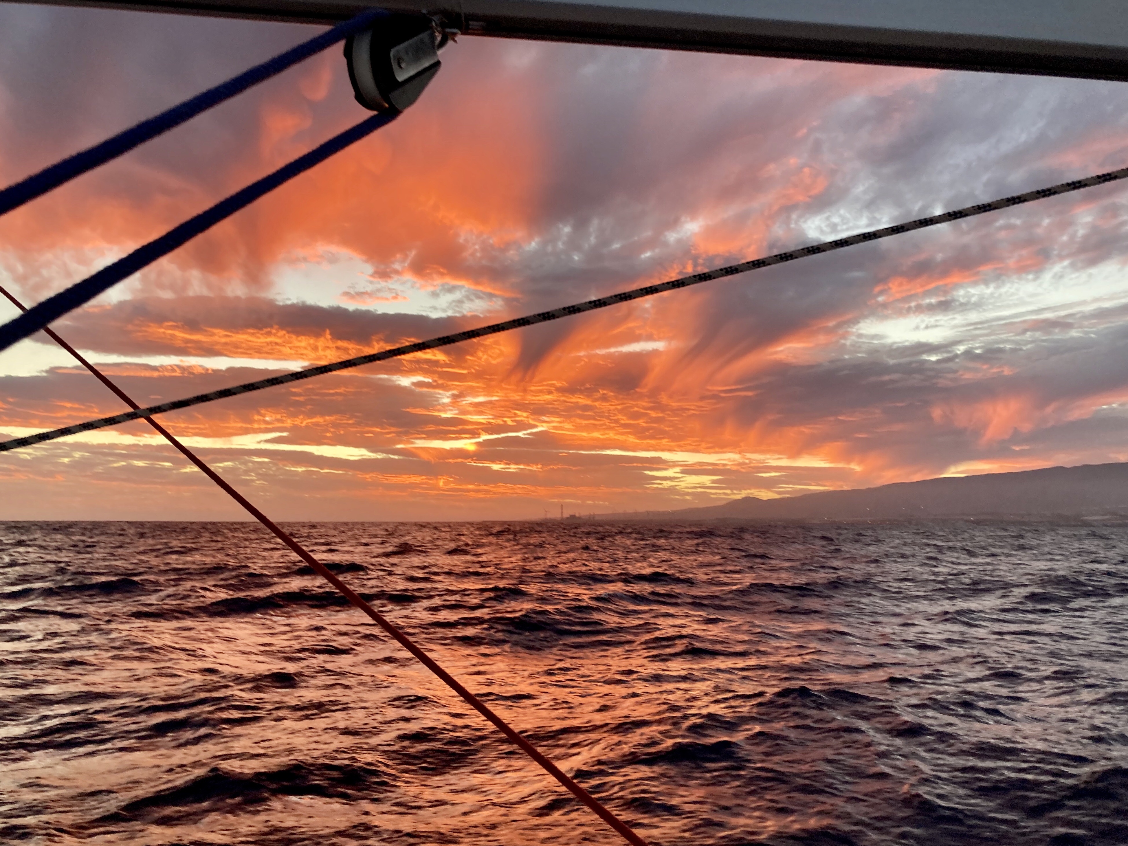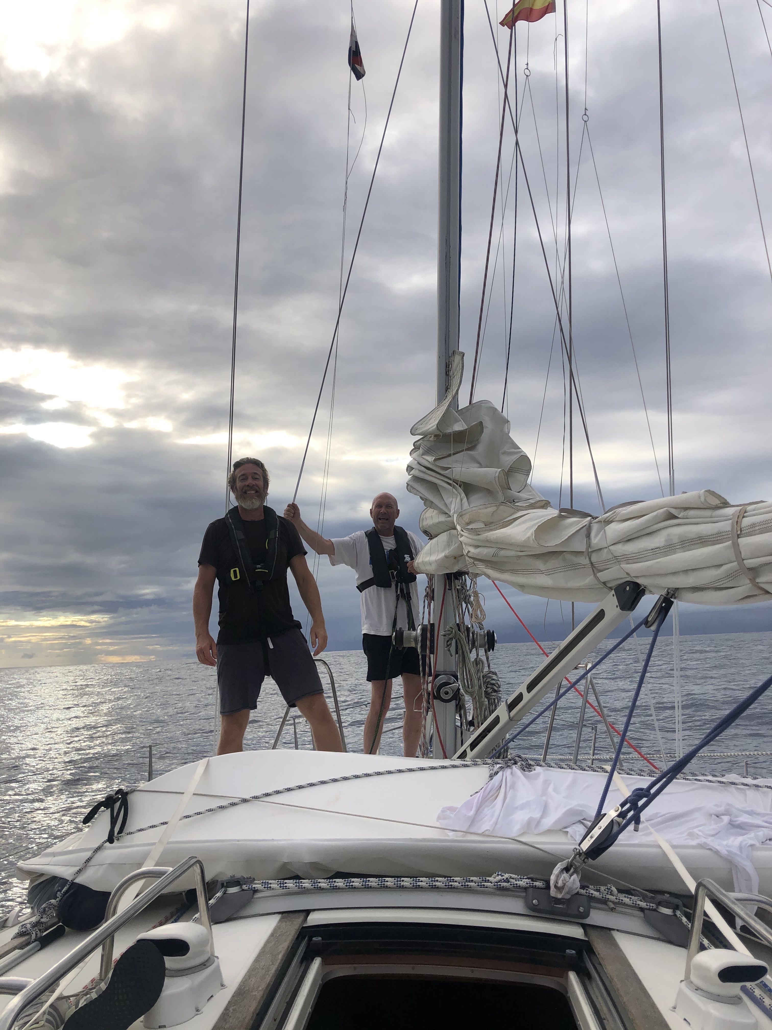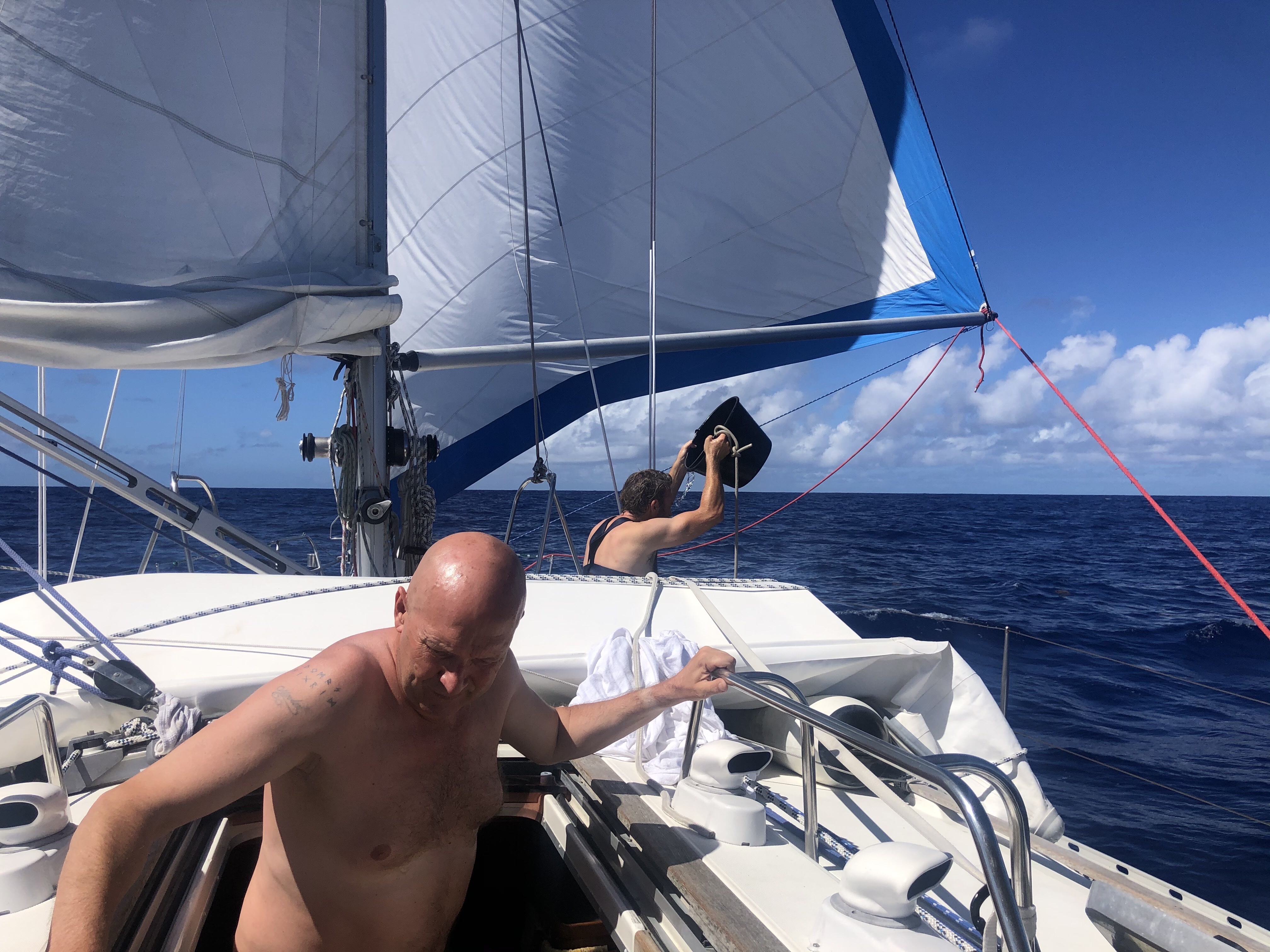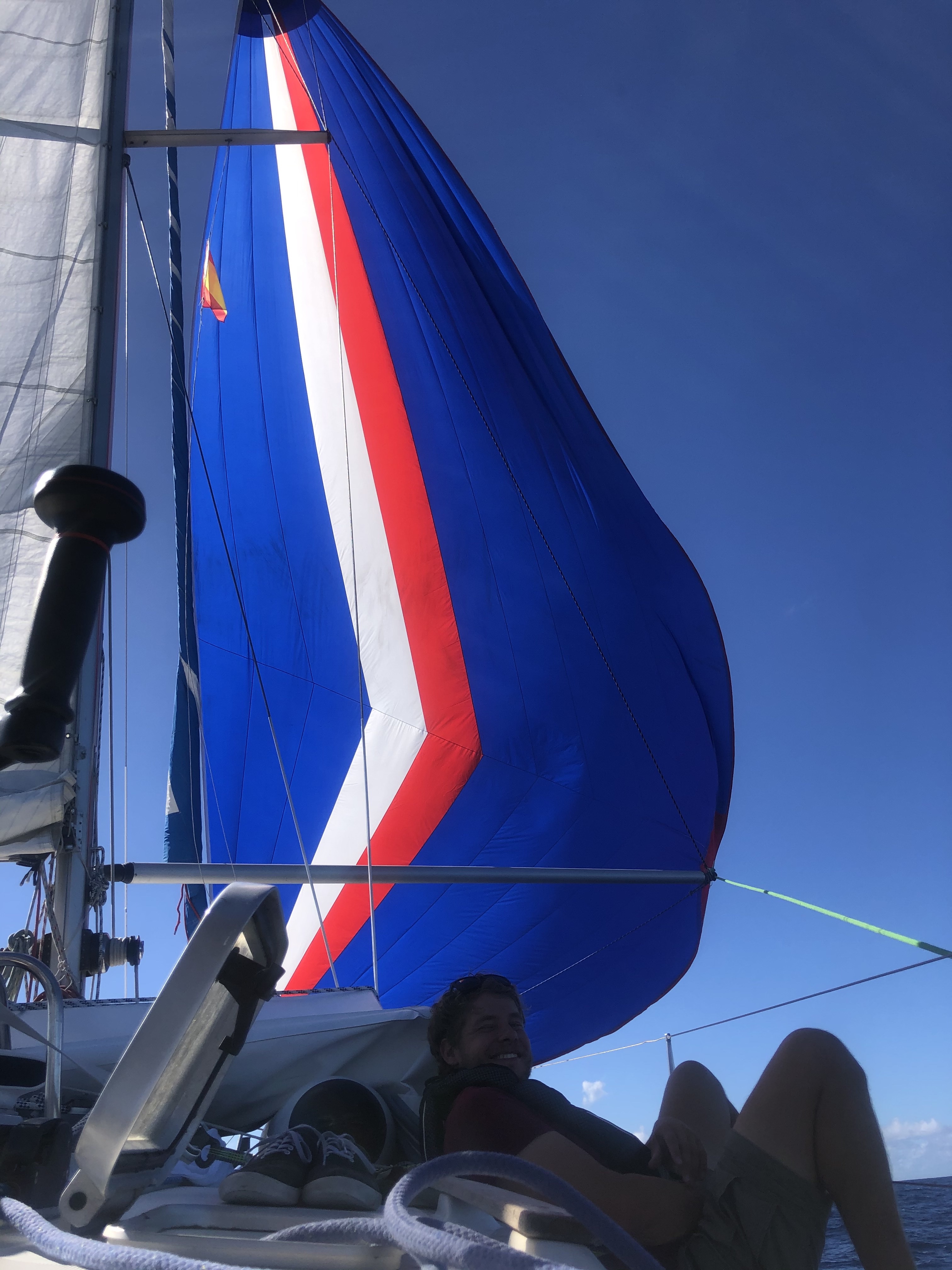 Natten går også for motor. Himlen er fyldt med stjerner. Hen på morgenen slukkes motoren, og vi sætter sejl. Vinden er stadig alt for svag, og det er varmt. 28 grader nede i båden. Vi forsøger at sætte spinakkeren. I første forsøg sættes den helt forkert, nærmest på langs. Da den skal ned, ryger den i vandet, og vi sejler over den. I andet forsøg kommen den rigtigt op, men vores fart er stadig kun de 4-5 knob. Vi spiser burrito med kylling, kål, dåsegrøntsager, bønner og ris – mums! Arjen spiller julesange med Michael Buble.