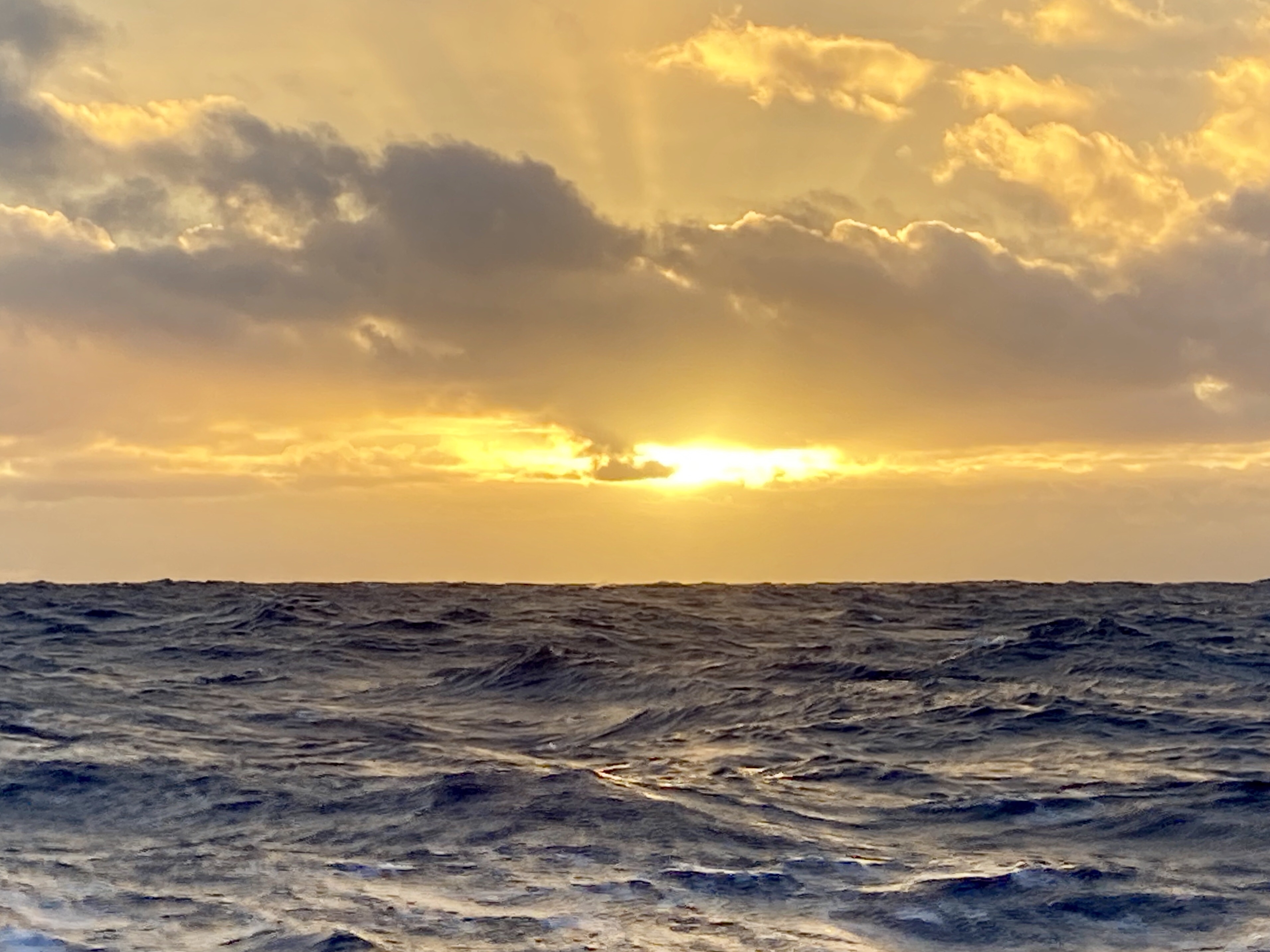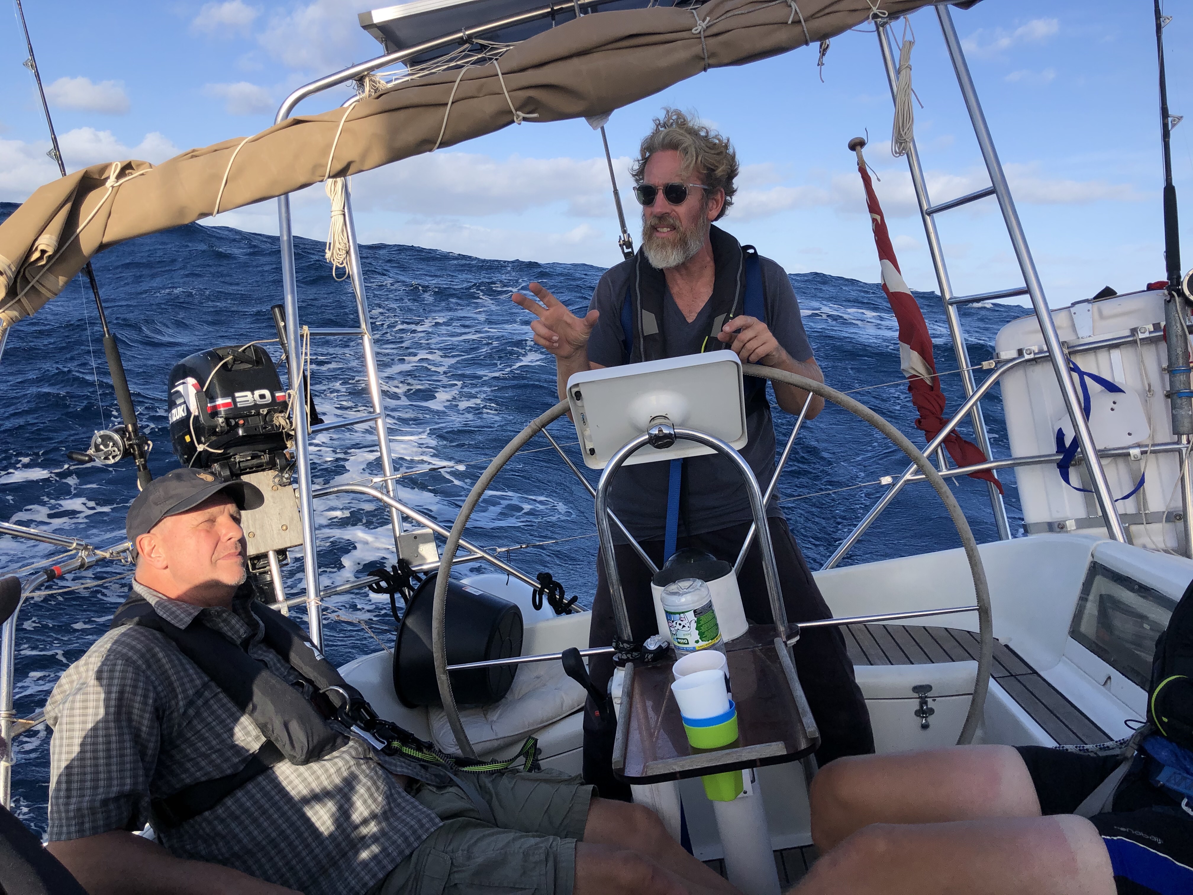 I løbet af morgenen er det blæst op og begge sejl er rebet. Søen er krabbet og bølgerne tager til. Vi ligger i udkanten af en front, som egentlig skulle være opløst. Håber det aftager snart, vi får pip af de bølger, som ruller os rundt fra forskellige retninger. Vi starter motoren for at få noget juice på batterierne, det har været ret overskyet på turen, så solcellerne har ikke ydet tilstrækkeligt. Midt på dagen ændrer vinden sig, og vi må af med spilerbommen og sejle halvvind – hvor kom det fra, her midt i passaten?! Spilerbomsnedhalet flyttes, så det trækker mere optimalt, og søgelænderet bliver påforet med et stykke vandslange, for at beskytte tovværket. Muddi får to flyvefisk i hovedet på sin nattevagt.