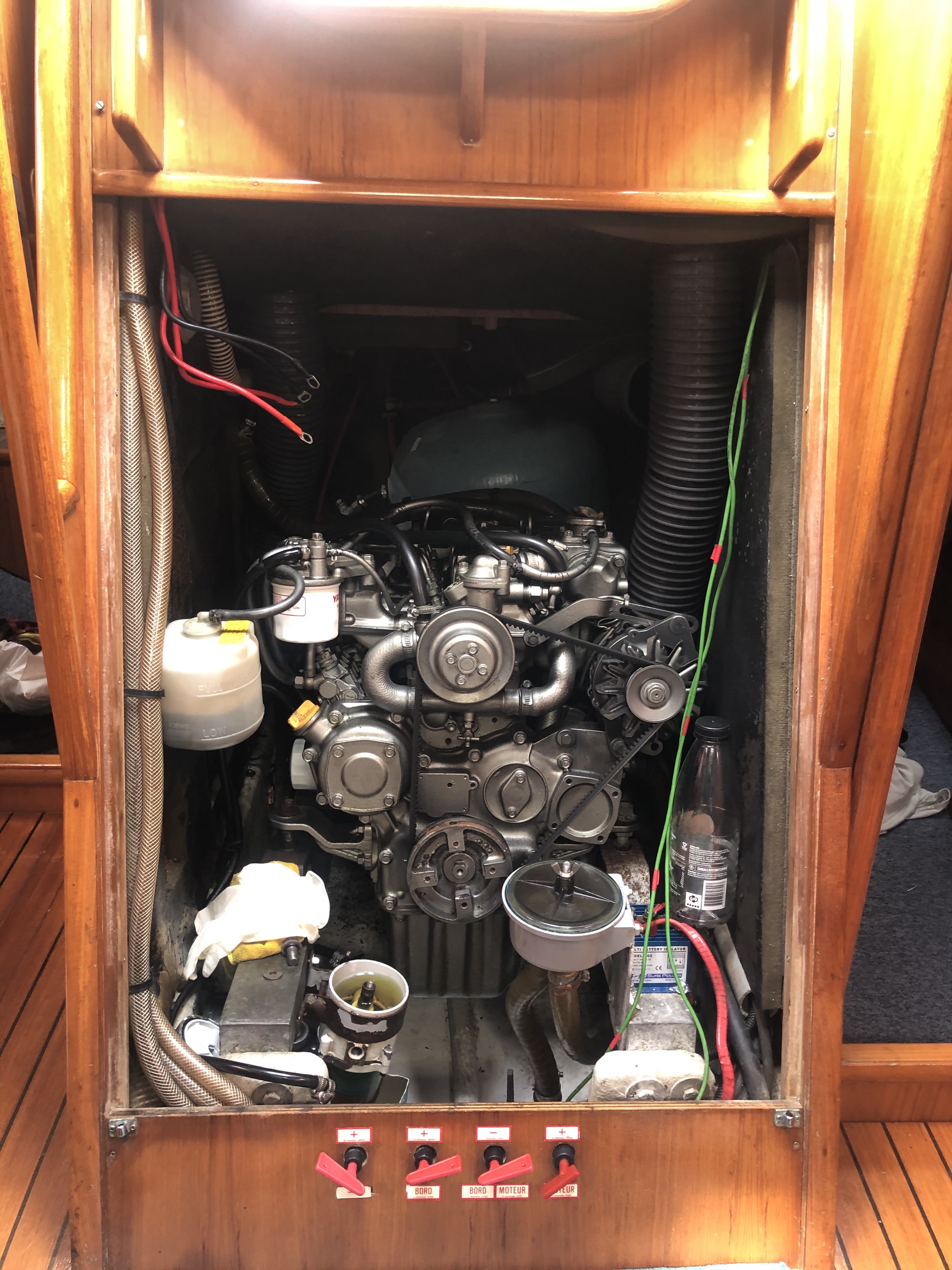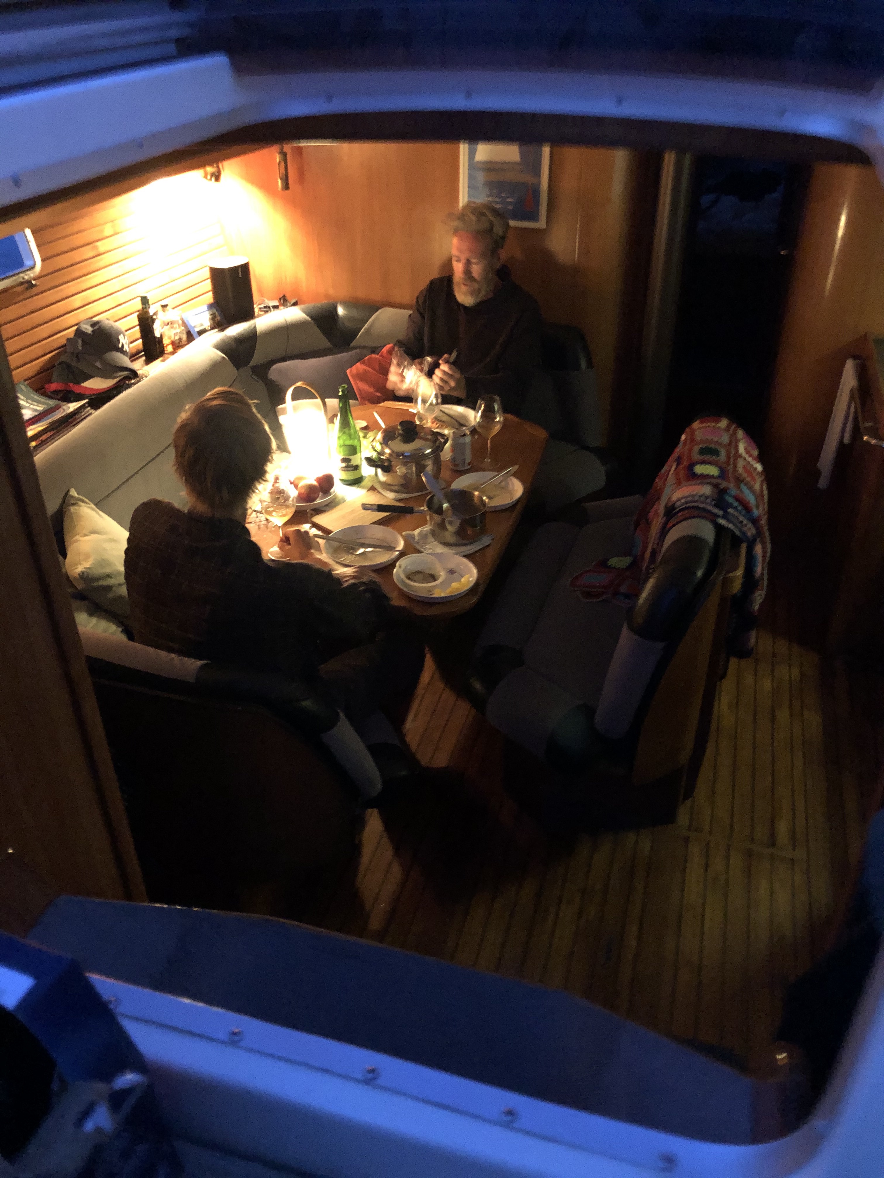 Bugten var allerede ved ankomsten lidt livlig. Det blæste op. Bådejerne sov ikke den nat. Vi blev kastet rundt i bugten, men vores nye Rocna-anker holdt os fast! Om morgenen kaldte vi havnefogeden, han kunne godt se, at natten havde været ‘a bit rocky’, så vi tøffede vi i havn lettere søsyge, og fik en plads på en isolerede havneponton – vi var ikke de eneste, som søgte ly. Nedtur.