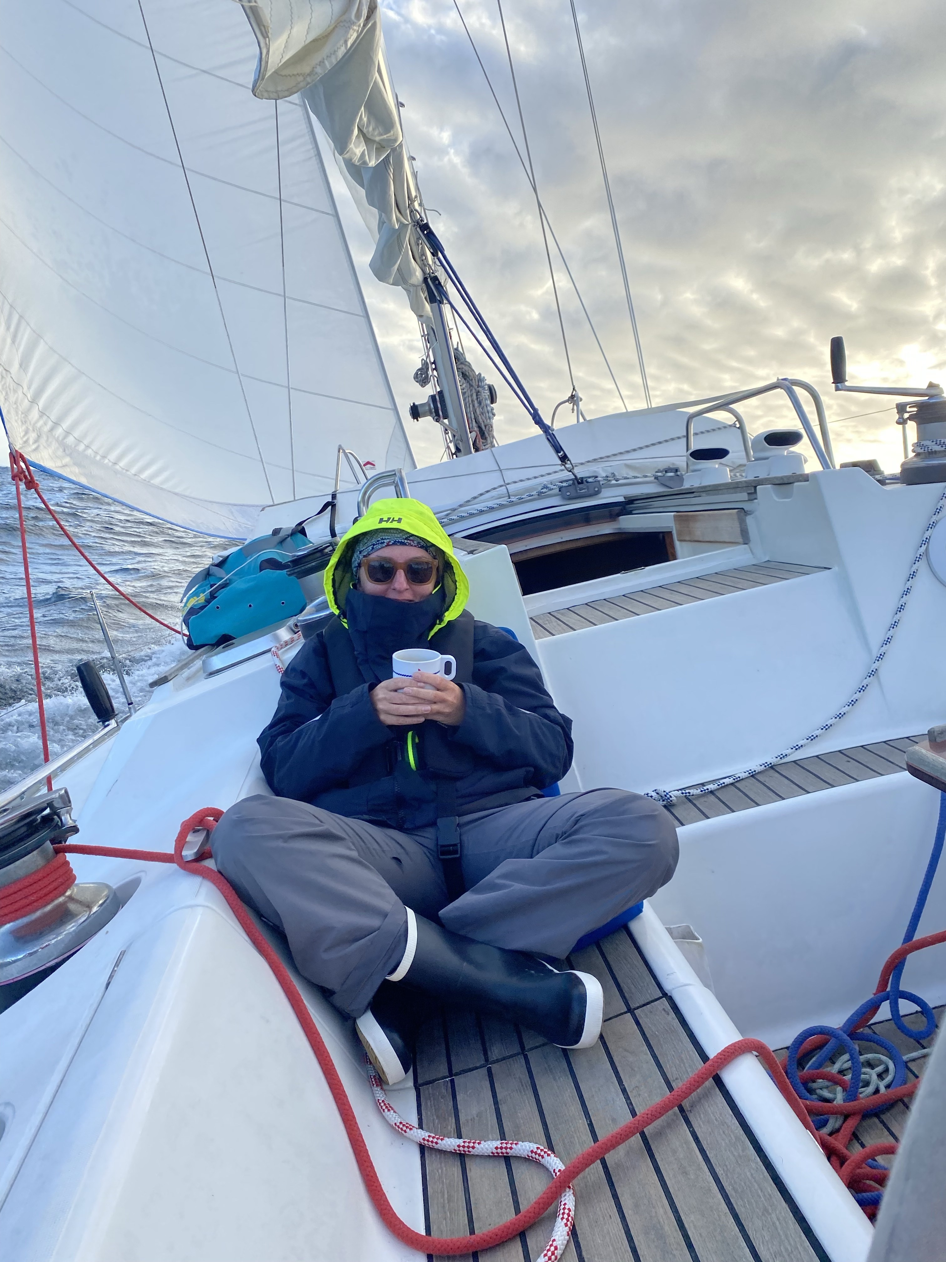 I Roscoff brugte vi tiden på at skifte tovværket til rulleforstaget, ordne luger, ankerlys og motorlys (igen!), fuge lanterne, proviantere og spise mad hos naboen. Vi stævner ud i det, der skulle være omkring 8 sm, men på et tidspunkt er vi oppe på 14 sm, og bølgerne kan slet ikke finde ud af, hvor de vil komme fra, og hvor de vil hen. Vandet står ind. Røvtur.